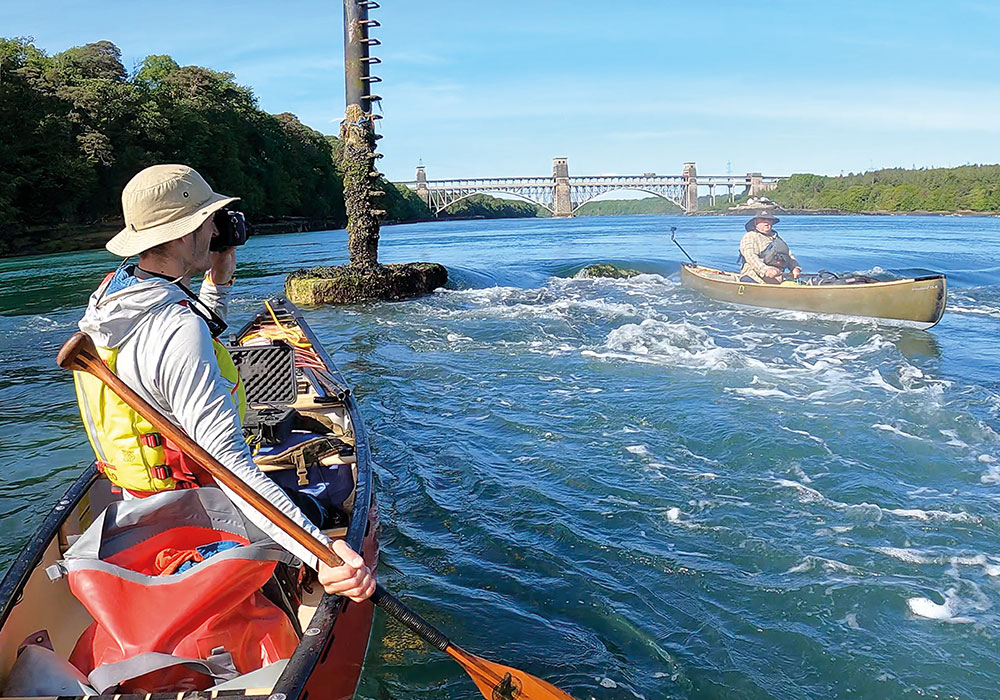 Then it was into the Swellies between Stevenson’s Britannia Bridge and Telford’s Menai Bridge. The current was running strongly, maybe 5 or 6 knots. The rock ridge of the Y Griben (the Welsh for ridge) was still visible with powerful eddies and shoots. I couldn’t resist and went for one of the eddies. Shooting across the eddyline, I carved deep into the eddy only to find myself on top of a monstrous boil/up welling of water. I giggled as my boat skidded across it with the occasional twitch, back onto the Swellies. Ollie and Dave had a real dynamic set of breakouts into its eddy, while I managed to get misaligned and only managed a rather sedate passage to the north.
