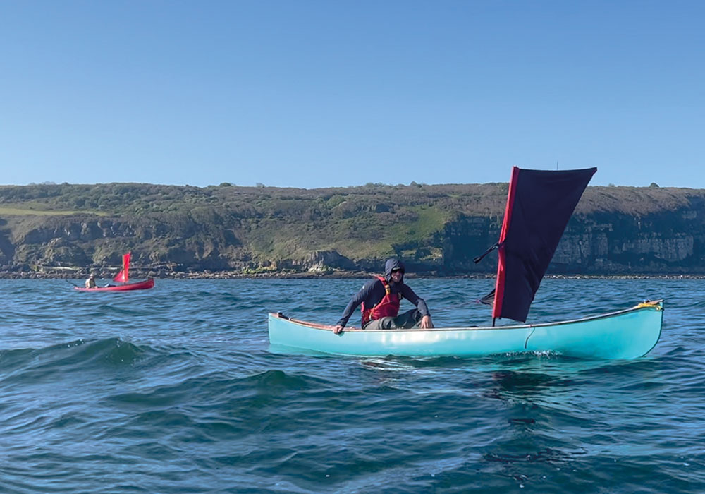 Tucked in under the cliffs, we were sheltered from the wind but not from the tide. The flood tide didn’t go cleanly across the bay and around Carmel Head. No, some of it hit the coast to the south of us before turning north and then around the headland. On the first little headland, the tide was running quickly against us. I misjudged it and ended up surfing outwards before finding enough acceleration to fight up against it. Tucked in tight, there was only one more point where we really had to make an effort. Sails up and with a strong east wind, we were soon hurtling along on an exhilarating ride. Just holding a stern rudder in place with the water singing off it was so fun.