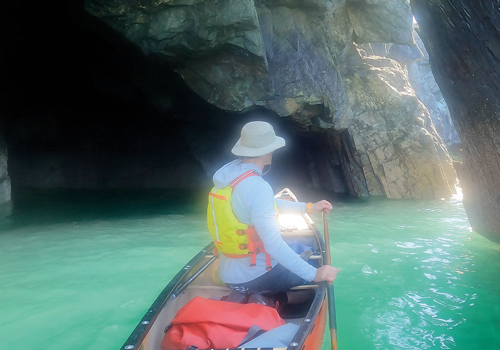 The tunnel has a very nasty weir just at its seaward entry, and it has a fearful reputation. We need to wait around three hours before it was safe to traverse. Tucked into the shelter of my canoe with the sun out and soft shingle to lie on, I made full use of the time and had a kip. Just before launching, Ollie suggested that we play rock, paper, scissors to decide who went first into the tunnel.