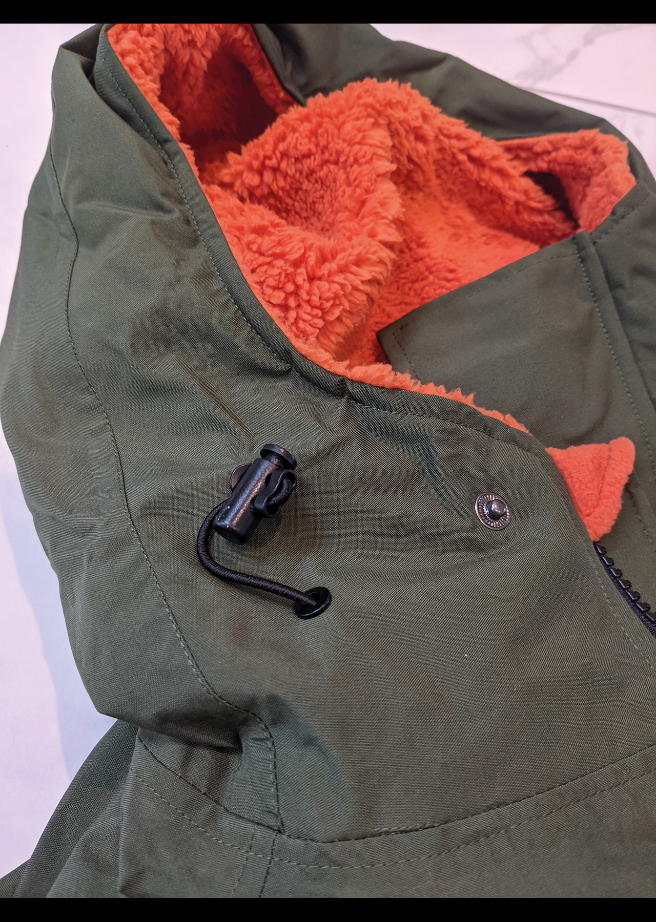 Firstly let’s start with the hood, a bone of contention with the previous robe as although lovely and big and snuggly, it was a wind flapper! The new hood has taken on board those features of most coats and has an elasticated drawstring in the hood. This is much nicer as you can quickly tighten up and keep that pesky wind and rain out of the jacket. Also handy if chucking it over a young one to keep them warm after a dip.