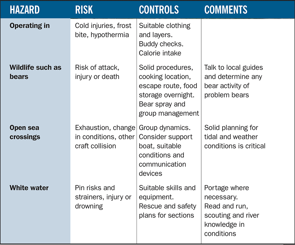 There is a risk of the turkey trap (everything is going well until Christmas – also known as the heuristic trap) and Whalley box colliding (you don’t know what you don’t know)! Make sure you thoroughly consider hazards, the risks and how you may control or reduce them. My expeditions have included operating in hazardous environments, including minus 50 ambient temperatures, travelling over frozen rivers, large open-water crossings by sea kayak, cycling in Africa’s wilder areas, avalanches, sandstorms, and many more. Part of the trick is to consider control factors and mitigation to reduce risks (see table on opposite page).