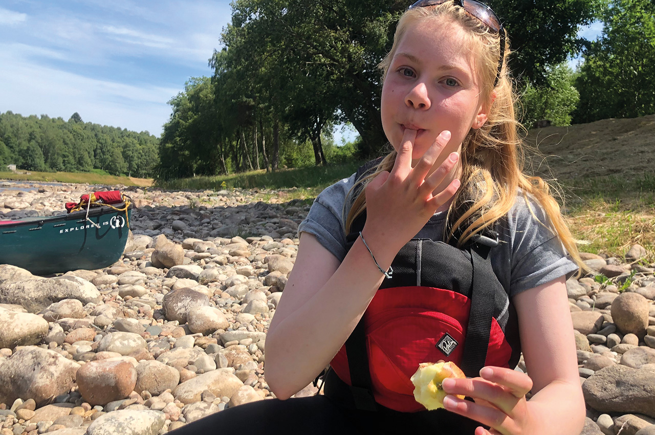 Day three was another lovely sunny morning, and although we thought it might rain at some point, it didn’t. The river level had gone down again, so it was a bit shallow in places, and dad needed me to get out and help push again. There were more rapids today, but some of the ones that looked the most fun were rocky in places, and dad had to line the canoe down them. At the bottom of one big rapid, we met a family swimming and playing on a paddle board.
