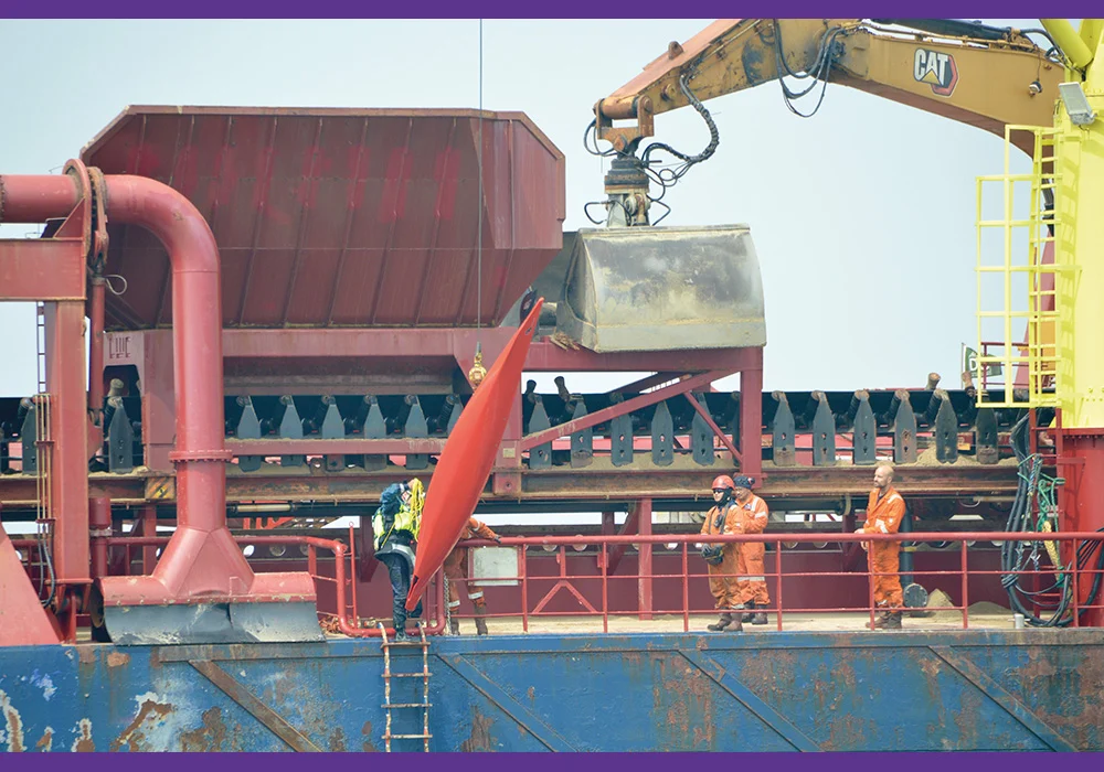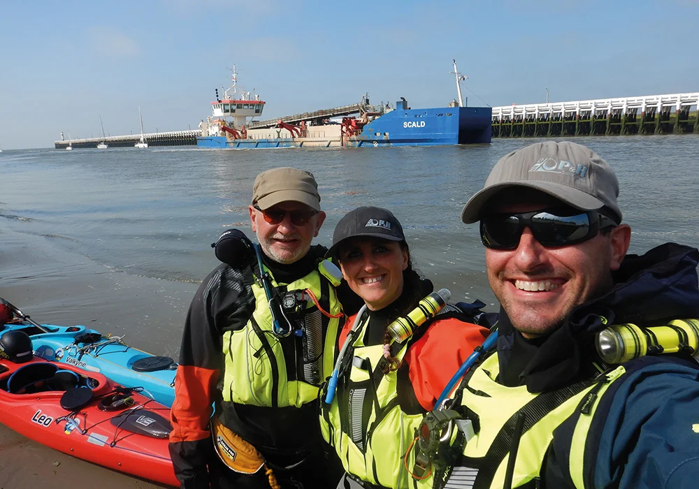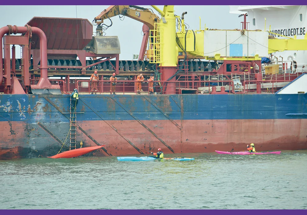You know who we are? We are sea kayakers, deeply interested in and specialised in everything related to safety within the sport. And we go very far in this, putting ourselves in specific situations or places. Do you know the RIO and its crew? The Rio is a Trailing Suction Hopper Dredger (T.S.H.D.) with a length of 82.35 metres, a draught of 6.2 metres and a professional, super enthusiastic crew. The ship is a monster compared to us in our tiny kayaks.