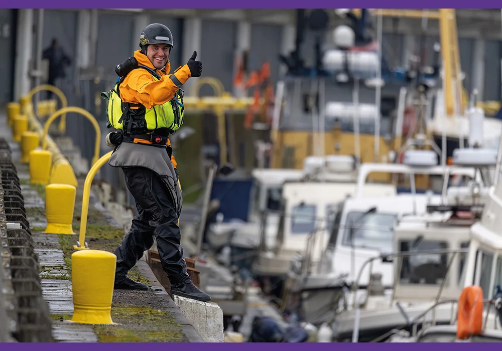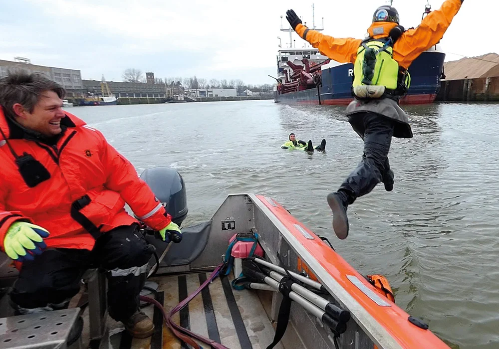With the lifeguard jump, you jump from the side, from a RHIB or something that is not high. Legs are scissor-like, and arms are wide open, breaking the impact on the surface. This ensures that the face stays above the surface, maintaining eye contact with the casualty or overseeing the situation. This is a jump we often perform when training with the Coast Guard (IKWV) during the summer months. When exiting bigger ships, we frequently jump from a higher altitude.