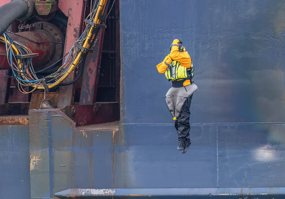 This was also a perfect exercise regarding solid, clear communication. The Rio again agreed to our plans, and we decided to regroup after their offshore dredging activities. Like all our similar exercises, this hasn’t been done before. Risk analysis; no risk of being pulled underneath the ship, no danger of being sucked into the props, and little/acceptable risk of capsize (with a positive outcome). The crew was ready and in place along the side since the captain would lose visual contact with me.