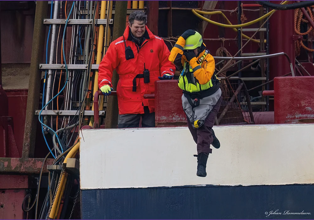 We must point out the mutual respect between us and professional shipping to understand how we got to this cooperation, which is unseen and unheard of. We know these people carry very high safety standards and must train (mandatory) themselves in different onboard safety aspects. On the other hand, they know that we aren’t lost tourists and that we train continuously on safety drills. We can tell you the following to answer a question we get a lot of, “How do you come to these cooperations?” We already have a “No!” for an answer; we can only get a “Yes!” So we dare to ask, straight to the point, without caring what people might or might not think of us.