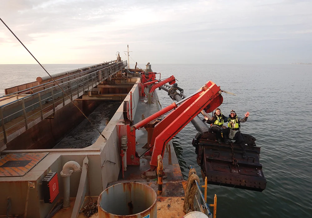 The sea was calm, which was perfect to test things out. What an opportunity! My team included Bo and Hugo. I asked them to stay out of the way until we were sure this would work out. We had a thorough safety briefing prior to the exercise. Although I felt the blood pumping through my veins, there were no moving parts where I could get stuck. The pipe/drag head goes up and down, that’s it. It just looks and feels very intimidating. I could instruct the depth of the drag head to my wishes. After a few adjustments, I could climb swiftly and safely onto the drag head.