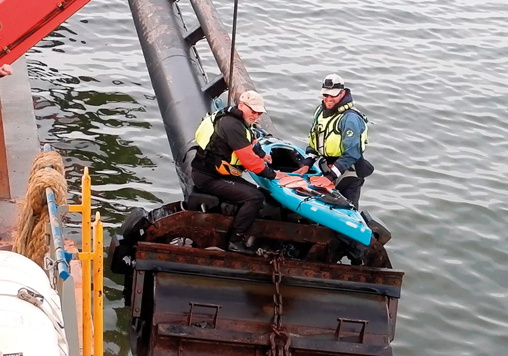 Once I was there, we tried the possibility of winching my kayak with me. I had a good look around for options. To our great surprise, I could shift my kayak over the top of the drag head. This part is covered with rubber inserts, making it perfect to avoid any scratches or damage to the hull of my boat. Once in place, my kayak rested on the pipes and the drag head, with no risk of falling off during the winching. It was just like it was made for winching kayaks instead of dredging the seabed, no kidding! I was winched with my kayak, and with the crew’s help, I could transfer myself and my kayak onboard the SCALD.