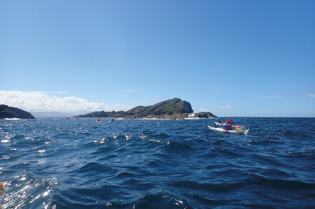 All was very easy for the first 3km or so. We could see a lot of white water around Eilean Mor and Eilean Beag in the distance and to the south west. We were now opposite and close to our’ breather bay’. From here on, eddies and places to hide from the flow started to diminish. Sections between eddies taking a lot of grunt and incoming swell threatened to push us on the rocks. But our cunning plan allowed us to drop back into the breather bay for an early lunch and opportunity to watch the fast and swirling water as it poured through the gulf. Half an hour or so, and the flow had visibly dropped.