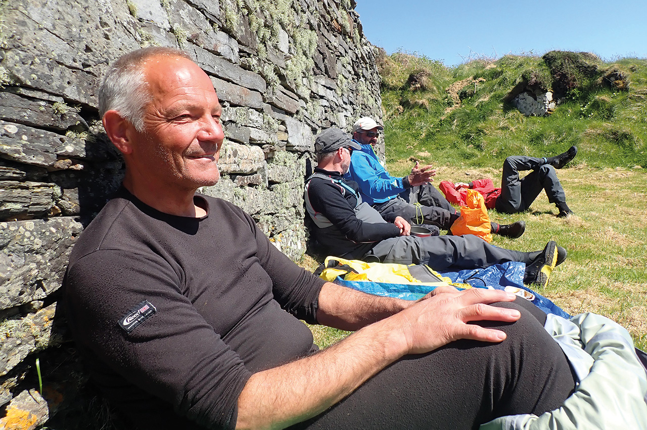We left our beautiful lunch spot to complete our transit of the Corryvreckan and enjoy the west and northern shores of Scarba in beautiful sunshine. Our group now separated. Half went to savour the flood in the Grey Dogs as the rest of us had a delightful rest and second lunch on Guirasdeal. We all joined up on Eilean Dubh Mor, which we are reliably informed does not translate to ‘tick city’. Ticks hereabouts seem to be quite athletic. Our beach clean up fire resulted in our friend burning a small hole in his shoe. A ‘doras-beag’ it seems for the tick he found 33.5 inches higher?