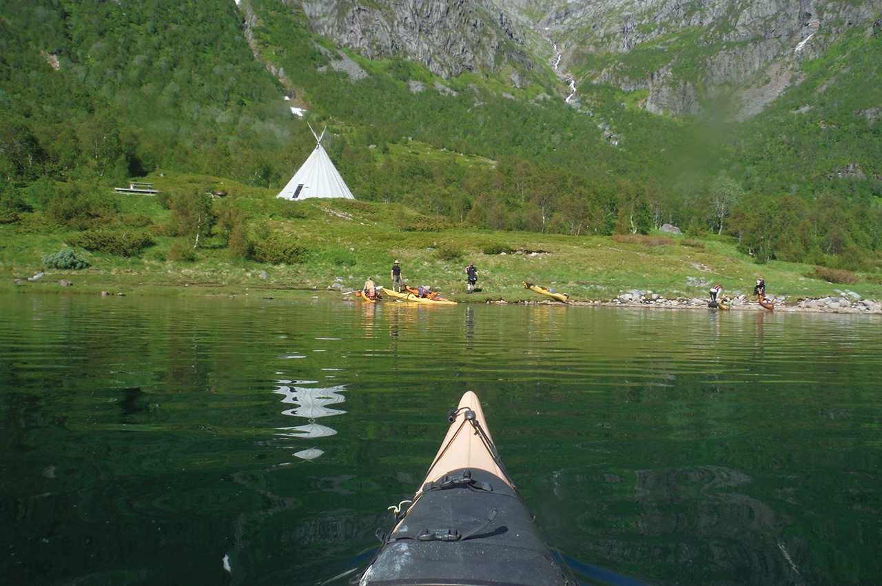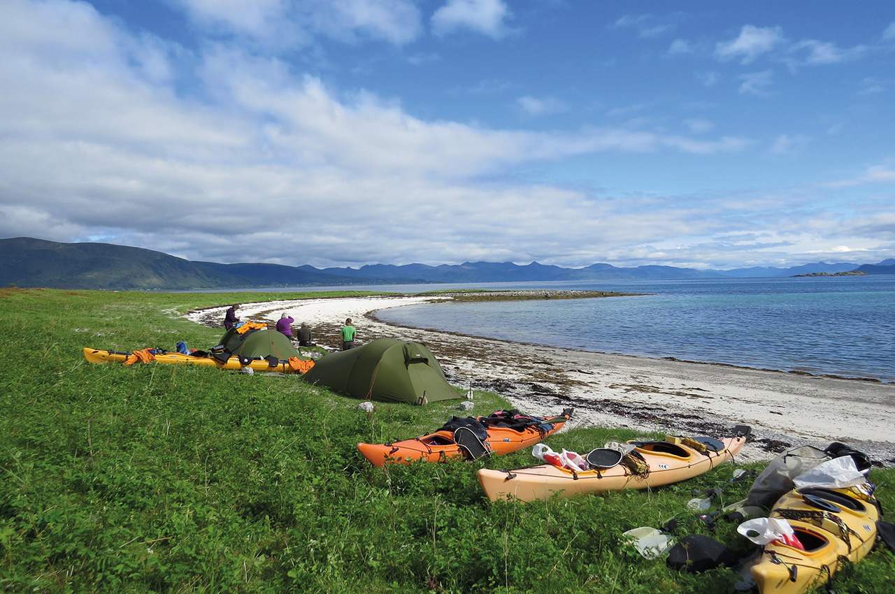 Our get-in was at Holdøya, from where we paddled to our first camping spot on the small island of Slattøya. We set off into a steady drizzle, but were immediately rewarded by sightings of otter, harbour- porpoise, a pair of White-tailed Eagles and an Arctic tern. Once on the island, after checking carefully for cattle, we pitched our tents among the beautiful, springy Arctic vegetation. As there is no freshwater on the island, we were glad of the supplies we had brought. At night we listened to the sound of sheep going round the island clanking their bells.