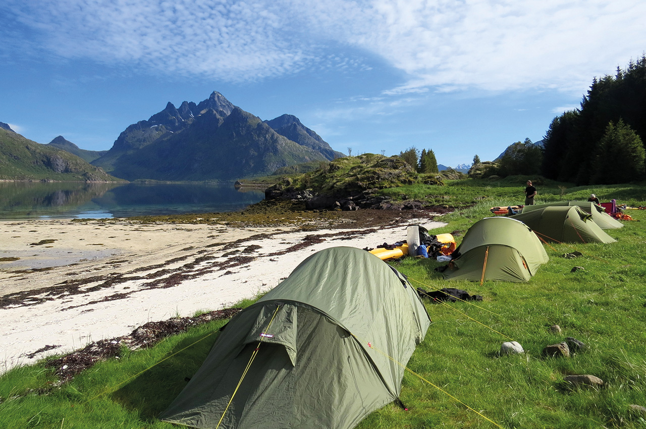 The next morning, we woke up to brilliant sunshine, the peaks of the snowy mountains embellished with white clouds. We first visited the tiny Falkfjord, which was rich in underwater life and where, to my surprise, Kristian said we could top up the water bottles from the stream – something that I have not done in the UK for many years. During a long day’s paddling we covered 24km and saw both Golden and White-tailed Eagle. As we headed towards Raftsund, we had tidal assistance but the wind was steadily picking up, making for some sizeable waves, and we were all grateful to reach a campsite that had running water and a drying room.