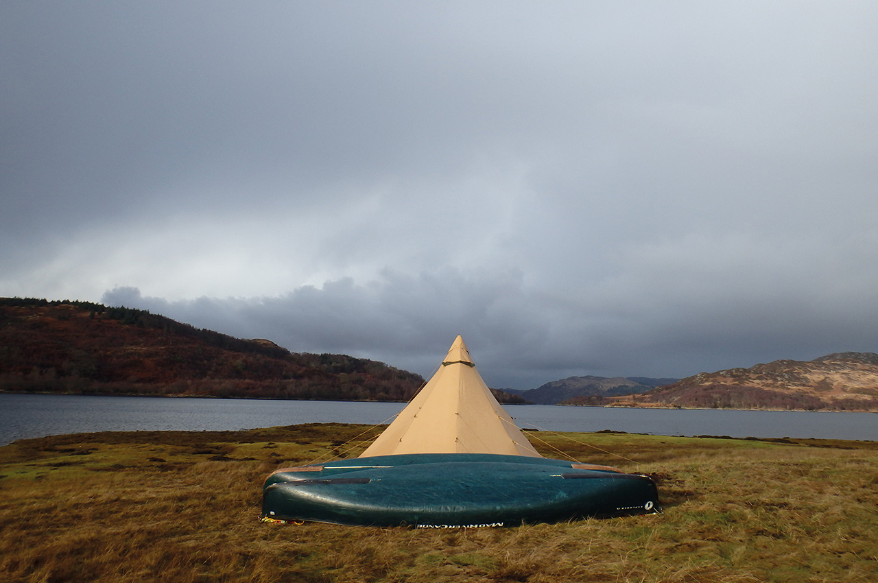 We awoke after a long night of raw gusting winds to the sight of the sun tiptoeing through the clouds, alas with not a hint of warmth, a faint wisp of mist enshrouding the tipi. Usually on expeds, each morning we pack up our kit and change locations every day so the chance to relax is always most welcome. A roaring stove soon took the chill out of the tipi inner and we enjoyed a pot of freshly brewed coffee, the aroma of which drifted out over the loch, along with the delicious smell of our hearty breakfast of freshly made pancakes, as thick as plates and drenched in maple syrup.