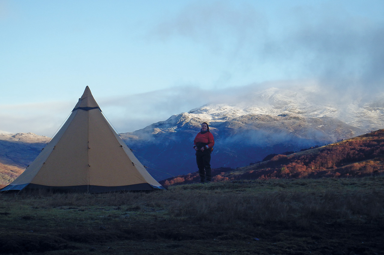 For us, the two essential pieces of kit necessary for long winter evenings in Scotland are a bombproof shelter and a warm sleeping bag, to ensure deep restorative sleep. This shelter could be in the form of a tent, a tarp or a tipi. For this kind of trip, a tipi was preferable as it provided a place to sleep, eat, cook, clean, store our kit and also socialise in. After watching the sun set in the snowy distance and with the coming forecast of driving rain and gusting winds, we battened down the hatches ready for a heavy night.