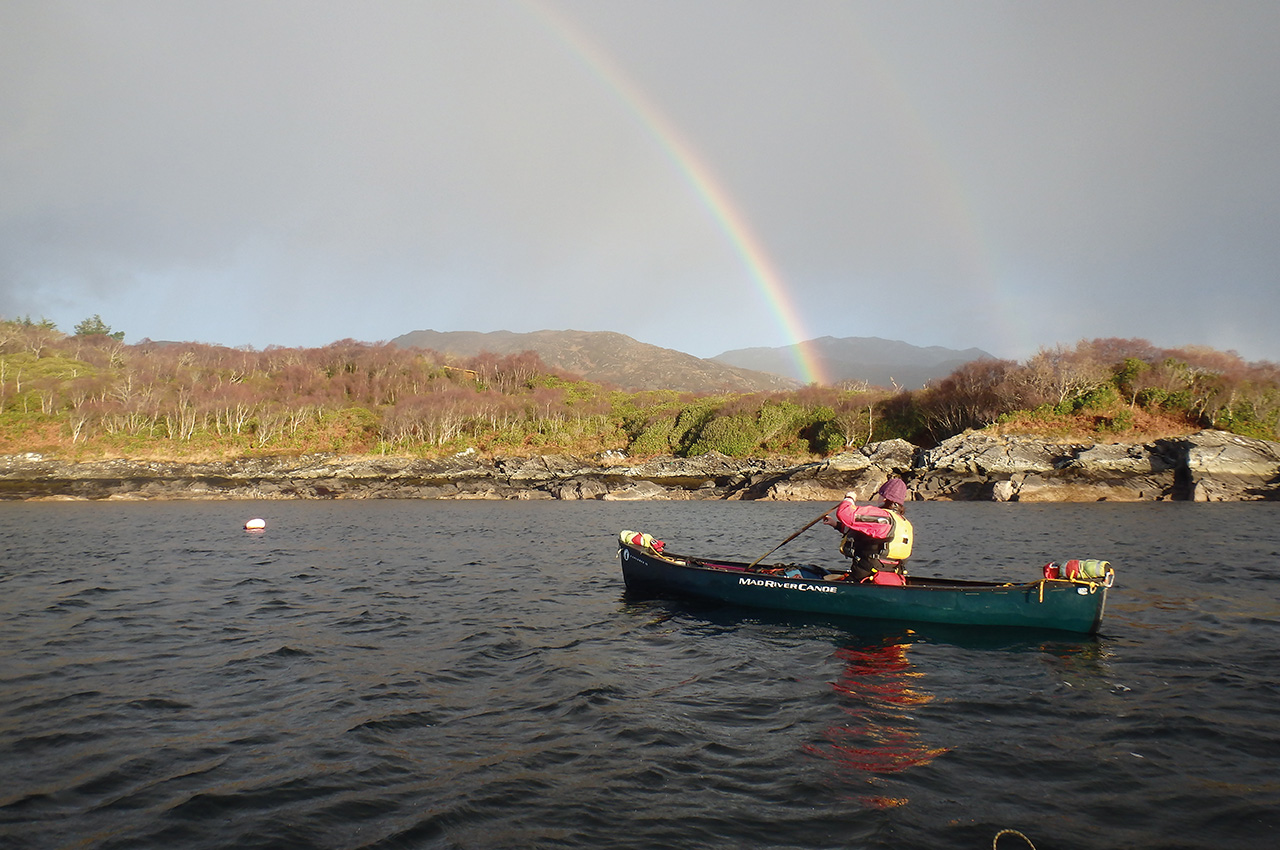 After paddling past Rubha Bheithe and Rubha an Aisig Mhoir, we made good headway across towards Risga and then decided to see if we could take a shortcut through the channel between Eilean an Fheidh and the mainland. There was a definite way through and although the water was too shallow to paddle, it gave us the perfect opportunity to pole our way back into Glenborrowdale Bay. The tide was receding quickly although we made good poling progress and only had a short portage to get back to the road.
