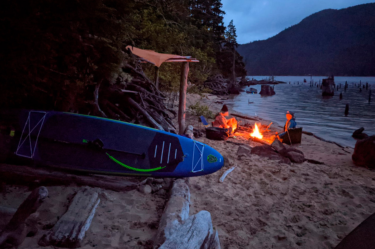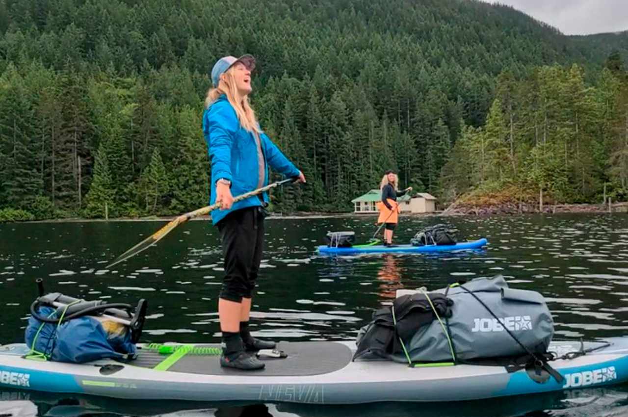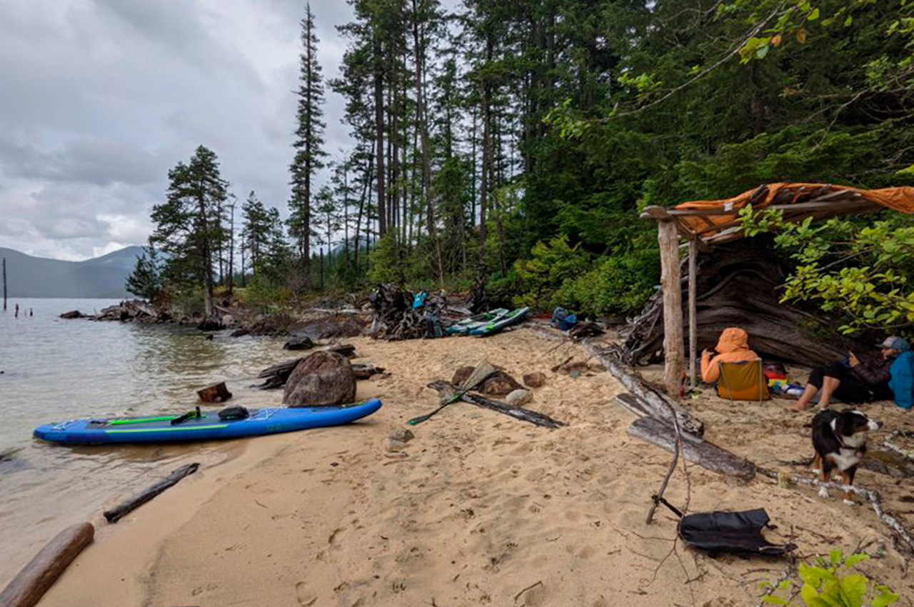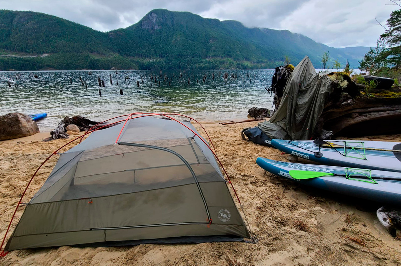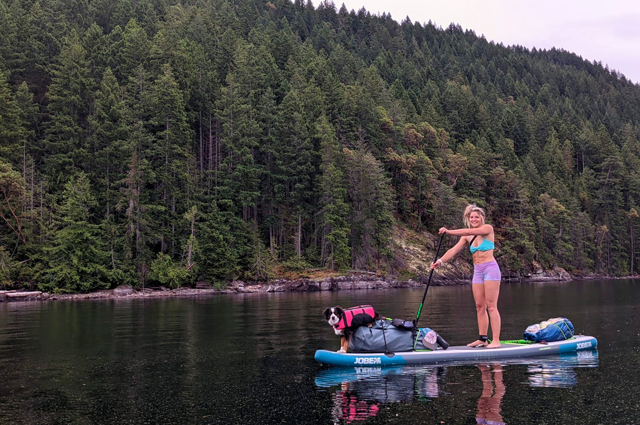 The trip began at the Mowat Bay Park boat launch at the south end of Powell Lake, one of the largest lakes on the Sunshine Coast of British Columbia. All three of us had inflatable Jobe SUP touring boards and multiple large dry bags stuffed with tents, camping supplies, clothes, food for six days, and whiskey. Nala (the ideal adventure mini Australian shepherd) was the first to jump on a paddleboard and wait impatiently for her paddler to join her. The air was warm, the stoke was high, music was playing from our waterproof speaker, and not even Crystel dropping her phone into the lake within an hour of takeoff could ruin our good moods. But if any divers are looking for a new iPhone 12, we have a local tip for you.