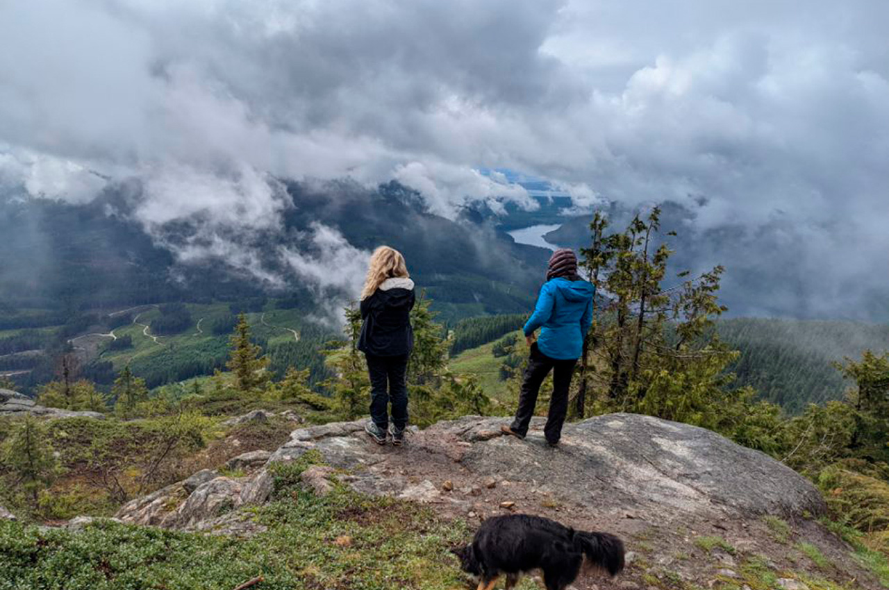 In the morning, the storm passed, and the clouds rolled by to expose one of the most beautiful 360-degree views we have ever seen. Tin Hat is the tallest peak on the Sunshine Coast Trail, and surrounding us, we saw mountain ranges, lush green valleys, and crystal blue lakes, including the one we had paddled down. That morning, we took our time to admire the view, drank our coffee, and eventually meandered back down to Fiddlehead Landing, finding the hut empty and our gear safe.