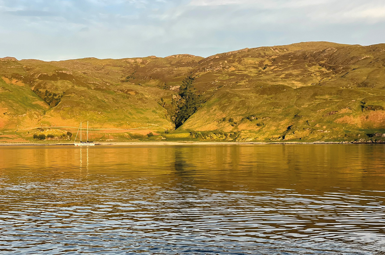 We set sail just after 17:00 after the safety briefing and guidance on using the ‘heads’ – toilets to you and me. The sun was still shining, and we had a superb three-hour trip up to Lochbuie, where we anchored close to Moy Castle. Our Guides prepped a delicious supper in the galley as the plan was to paddle that evening.