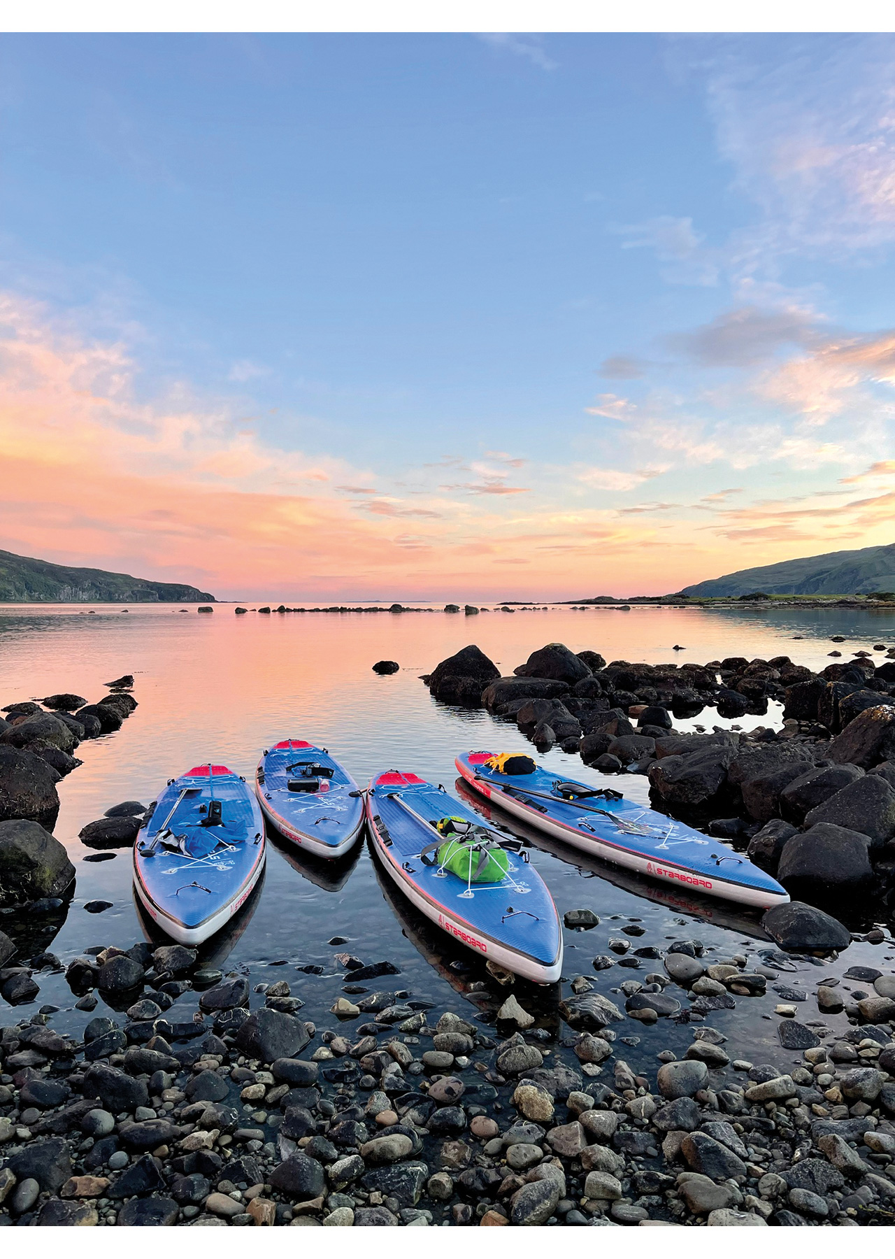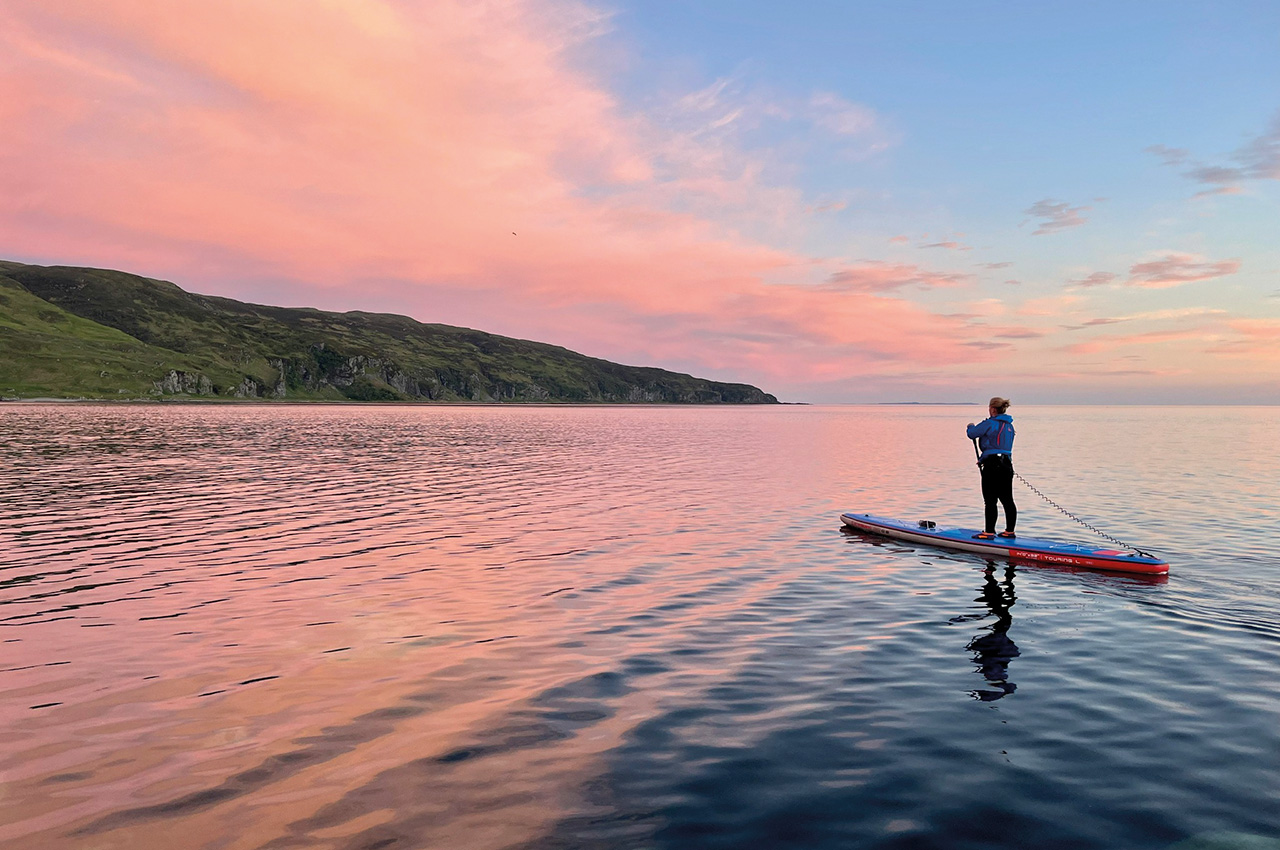 With some great teamwork, the boards, day bags, paddles and paddlers ended up where they should, on the water and paddling into the setting sun. Scotland is blessed with lighter evenings, so there was plenty of time to explore the still waters and Moy Castle; and two hours later, we paddled back to the boat at 22:30 whilst the sky and water turned incredibly pink – it was a truly stunning first paddle.