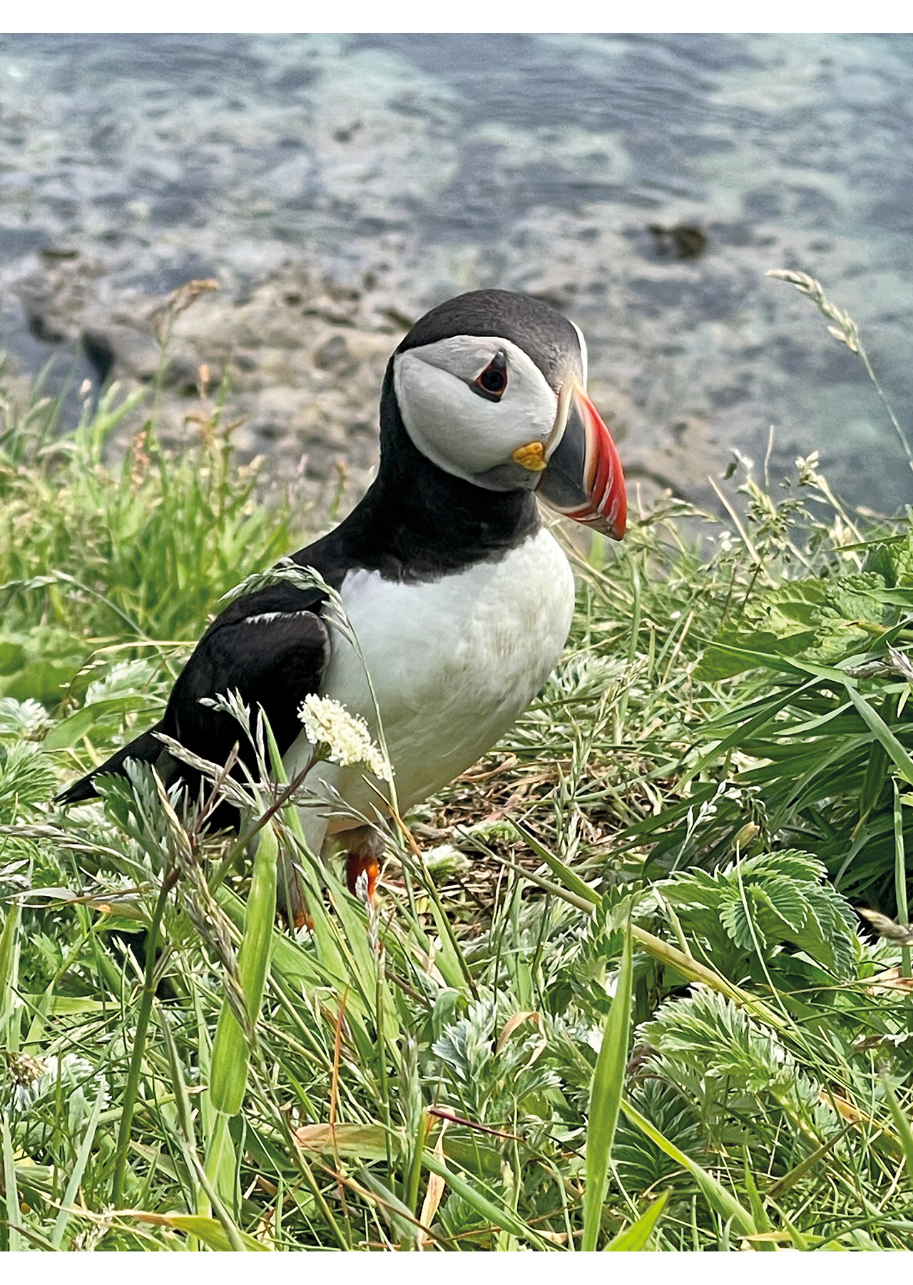 We landed on a rough beach and found a young lady collecting rocks. She was working on Staffa with National Trust Scotland for six months, coming in daily by boat to keep an eye on the island and its wildlife. She had a wealth of knowledge and guided us up to see the puffins, which Staffa is also famous for. They see humans as non-threatening, so they were happy to be only metres away from us. They are smaller than I imagined but delightfully comical in how they bob about when walking. Puffins mate for life and live in 1-2-metre-long burrows under the soil at the top of the cliffs.