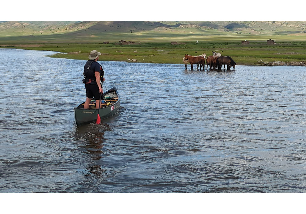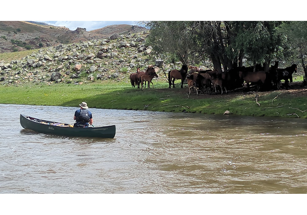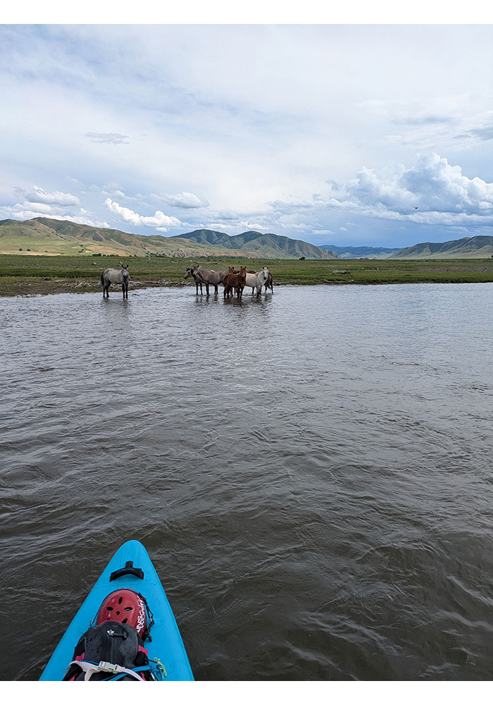 During the night, it had rained, and our tarp had collected a couple of pools of water. We took advantage of this fresh, clean water to fill up all our bottles and have a couple of extra cups of tea. We met a nomadic family beside the river. The father spoke no English, but his daughter knew a little. They were curious about our journey, and we were equally interested in their life on the steppe. We had questions about how they lived and what animals they kept. She had returned to the farm after uni in Ullanbataa. The canyon was slowly opening up, and we saw more signs of nomadic life as we paddled yurts, herds of goats, and horses running along the banks. We stopped to investigate an abandoned shack and stable, all made out of rough timber and trees felled from the immediate area.