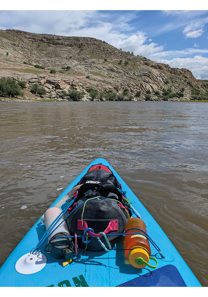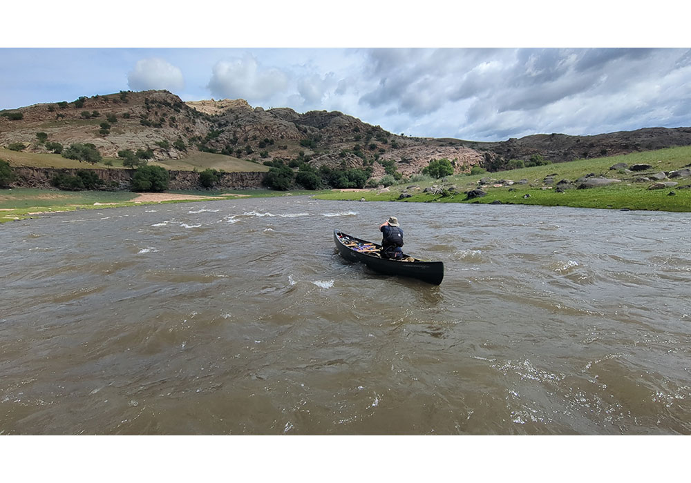 The canyon had opened into wide steppe country. The river had slowed, and we had some stretches paddling into the wind. Our meals mainly consisted of dehydrated packs, supplemented with fresh spring onions picked along the banks, a block of cheese, and our enormous chunks of bacon, although this was mostly fat. Bacon and cheese lunches became a daily highlight. I clipped my fin a few times today. The river was constantly narrowing and widening with braids weaving around islands. At lunch, I rearranged my bags to put more weight on the front of the board to try to lift the back. I had my deep fin attached and my short river fin in the kit bag.