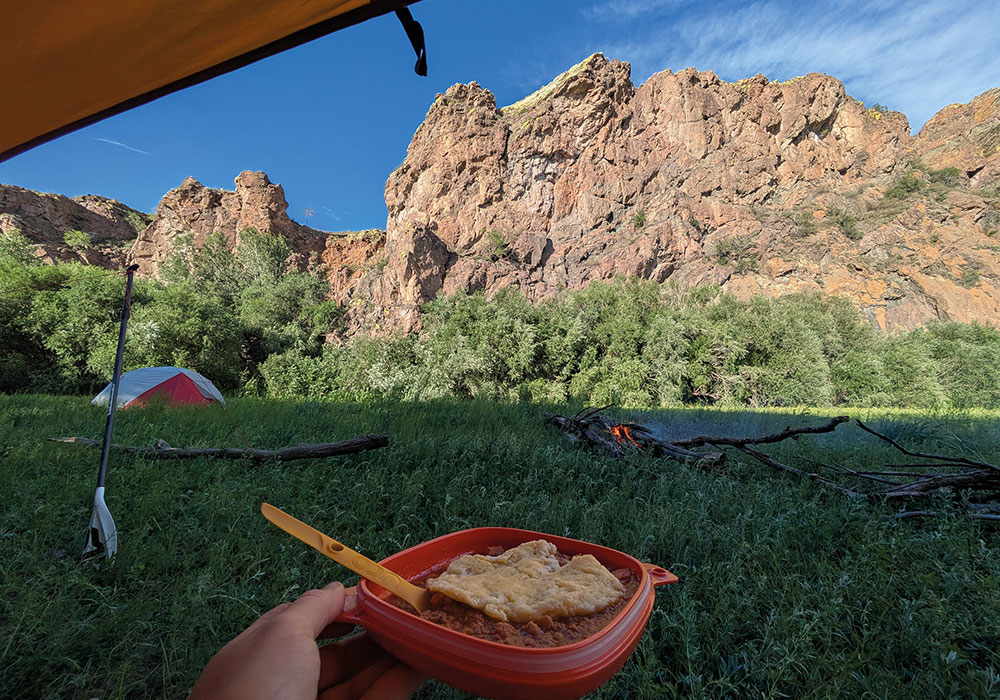 The river has calmed down; it still has waves and rock gardens, but it isn’t at the same level as it was on day one or two. The valley is changing shape and opening in places. We set up the tarp at camp again because the sky has been threatening rain. We could see the hills in the distance being hit with heavy rain. Phil had his fishing rod out at camp, trying to catch us dinner, but he had no success. Clean drinking water became a surprising challenge. The main river was brown with clay sediment, which quickly clogged our filters, and many ‘streams’ marked on maps were dry in summer, only flowing during spring snowmelt. Whenever we found a clear side stream, we filled every container we had – including the empty beer bottles from earlier in the trip.