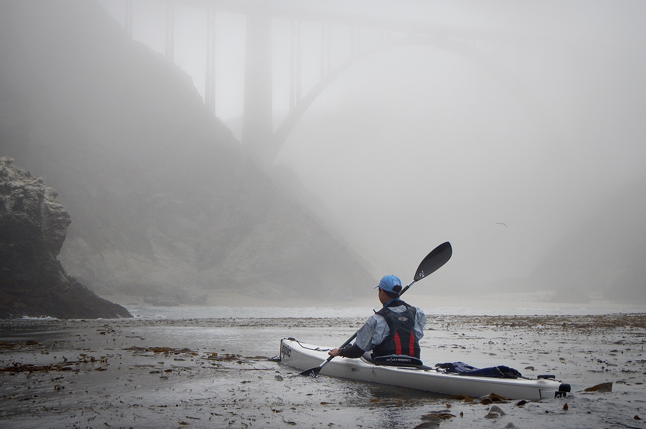 We land in the sheltered bliss of Bixby Cove, sip a some of water and attempt to throw some calories down rather than up. The absence of wind is deafening. The constant pressure, the strain, the wind’s howling eddies forming in my ears, the salt spray with each stroke, the chill of sweat and exhaustion… gone. This is a snapshot in time. A molecule of the sublime qualities of being, wordless and lacking definition to the mind. We sit relieved and smiling under the towering concrete cathedral of the Bixby Bridge once again.