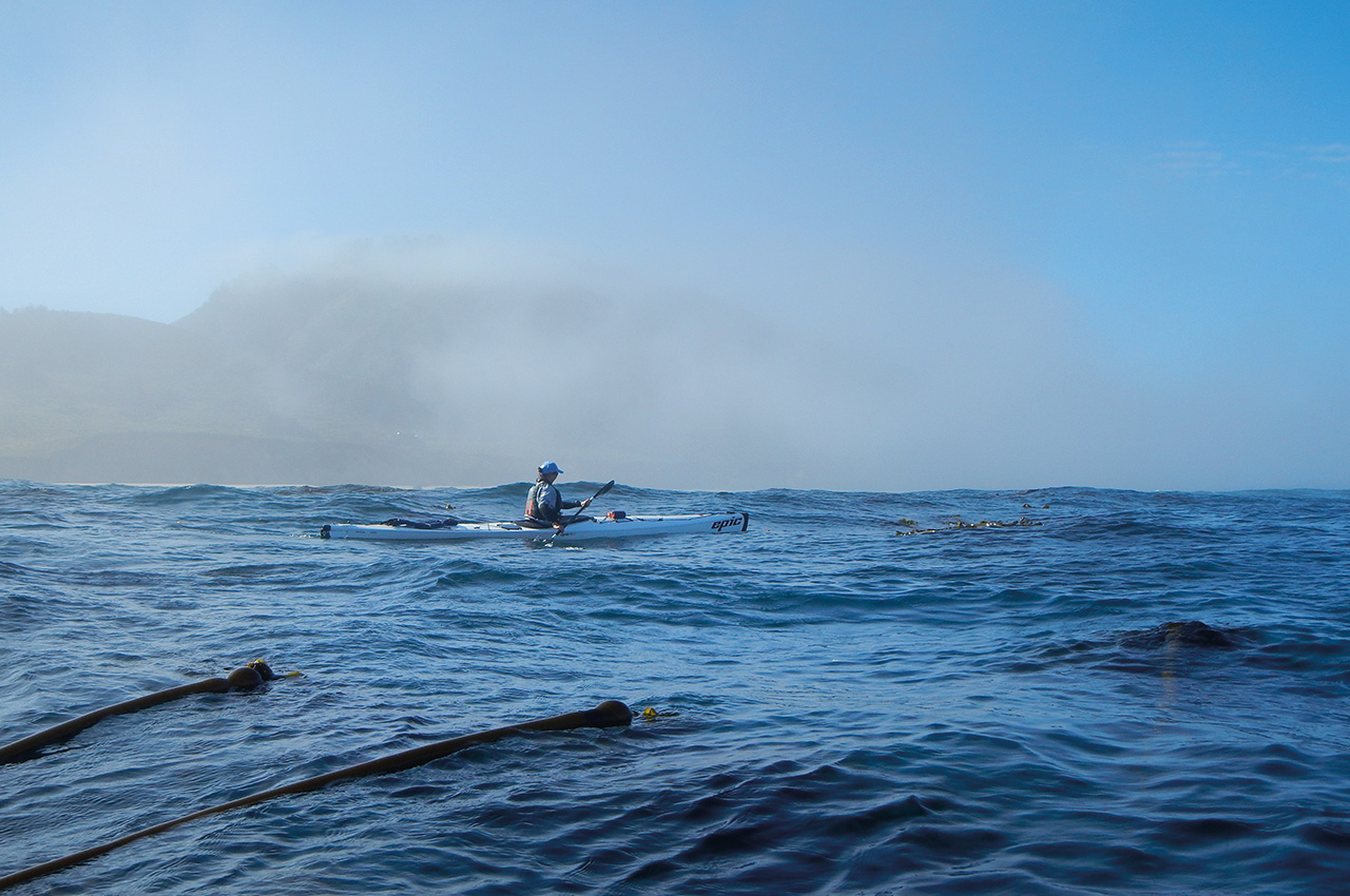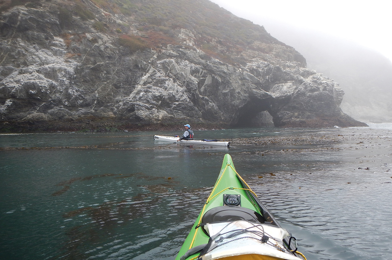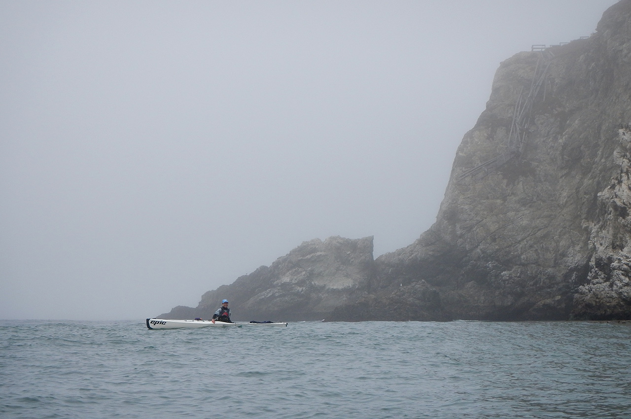 Paddling along the white sandy stretch of Garrapata Beach and around Kaiser Point, the fog teased our visibility in an uncomfortable dance of hide and seek. The steep Santa Lucia Mountains to the east were our guides. Travelling further south these 1,600 foot ridge tops disappeared into another time.