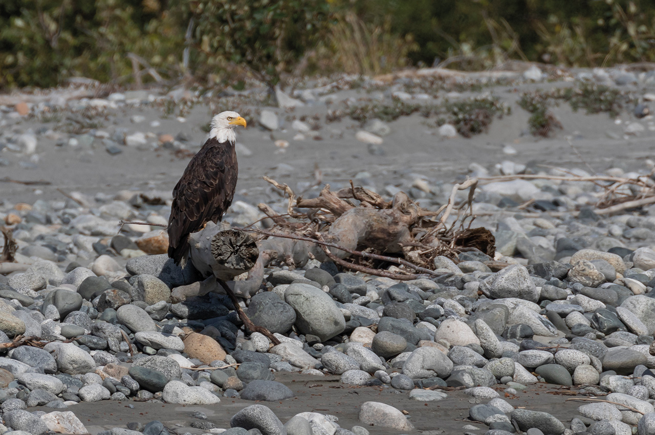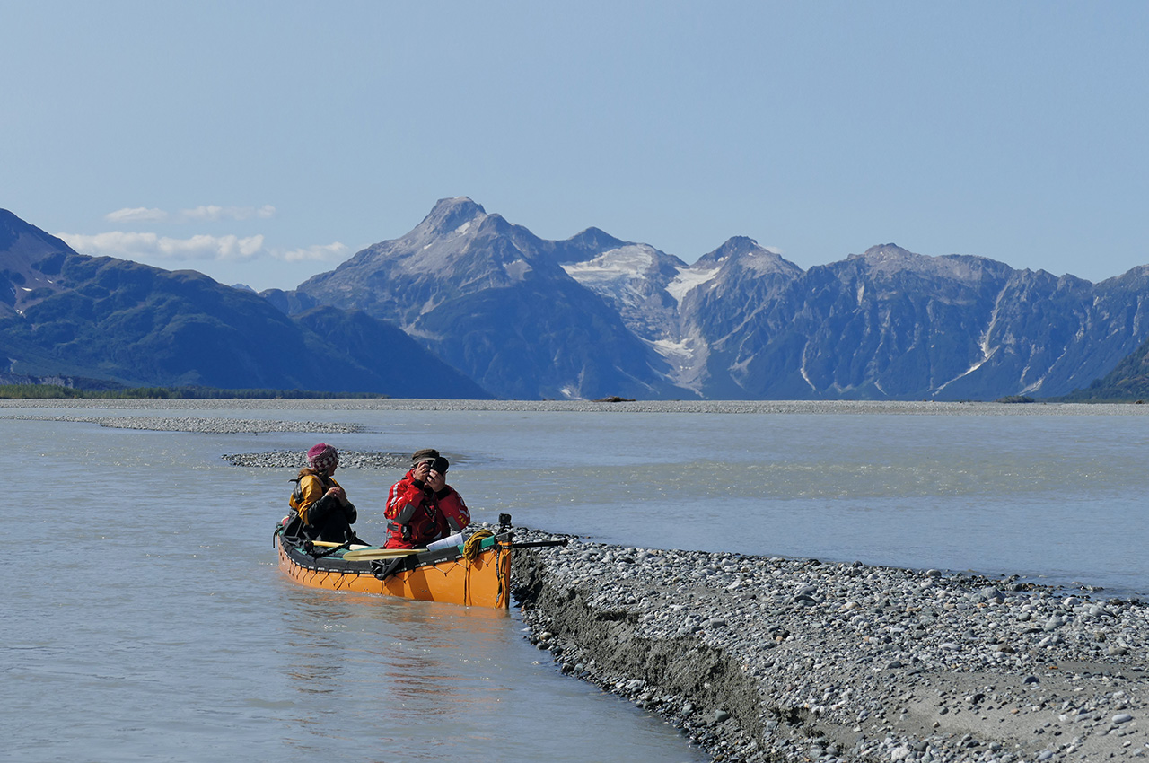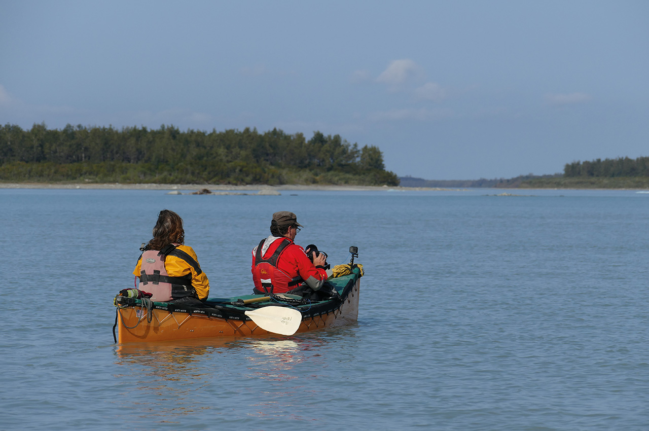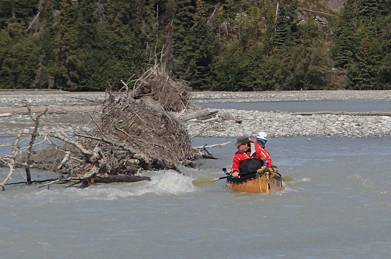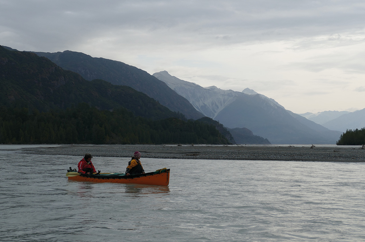 Grounding the raft was not an option! Karl and Alli, in the canoe till the end of the trip, were faster but aimed to keep within sight. The trees were growing taller as we neared the ocean, and today felt like a distinct change in the landscape as the Tat Valley fell steeply away towards the more expansive valley after the Alsek junction. Adrenaline was high as we swept the bends into the shadows at the edge of the river and then back out into the sun, all the time hoping not to meet a river wide hole on the next bend!