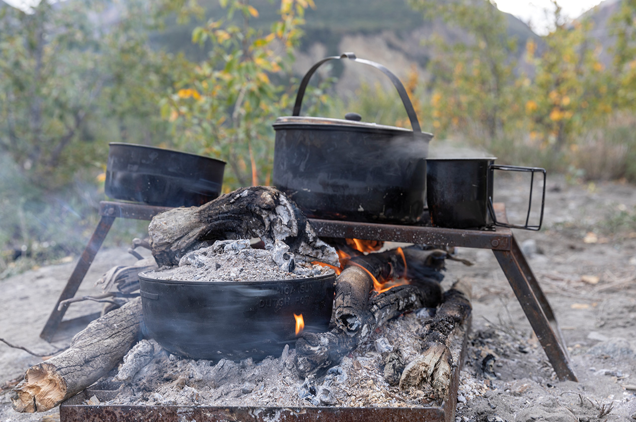 Here we were blessed with the lot, and a swift current, which gave us less grinding effort and more changes of scene. Our camp, on an expansive outwash above the Tkope Creek, was so good we could all watch a bear about half a mile away lolloping along looking for food, thankfully heading out from us.
