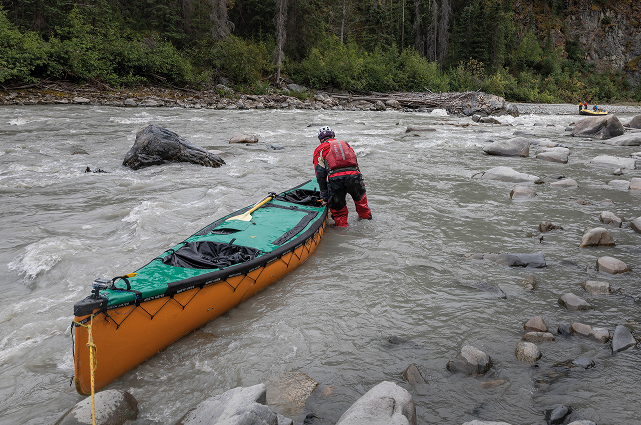 The gradient and volume had increased with giant boulders in the main channel, but we could see no drops, and there were eddies to go for. As soon as we joined the flow again, we were dinging invisible obstacles but slaloming those we could see. And then the boat shook with a gut-wrenching crack as we boofed a boulder we hadn’t noticed; after a fight to stay upright, we gained quiet water and came alongside the raft. Hands under the hull, there was a crack but no hole – thanks, Wenonah!