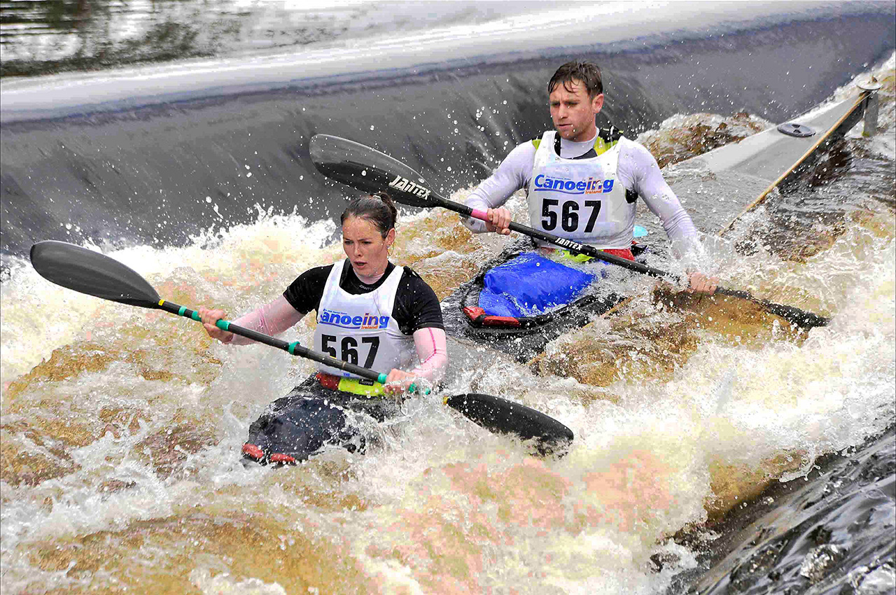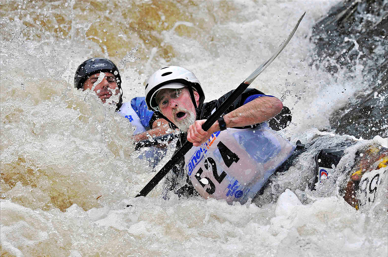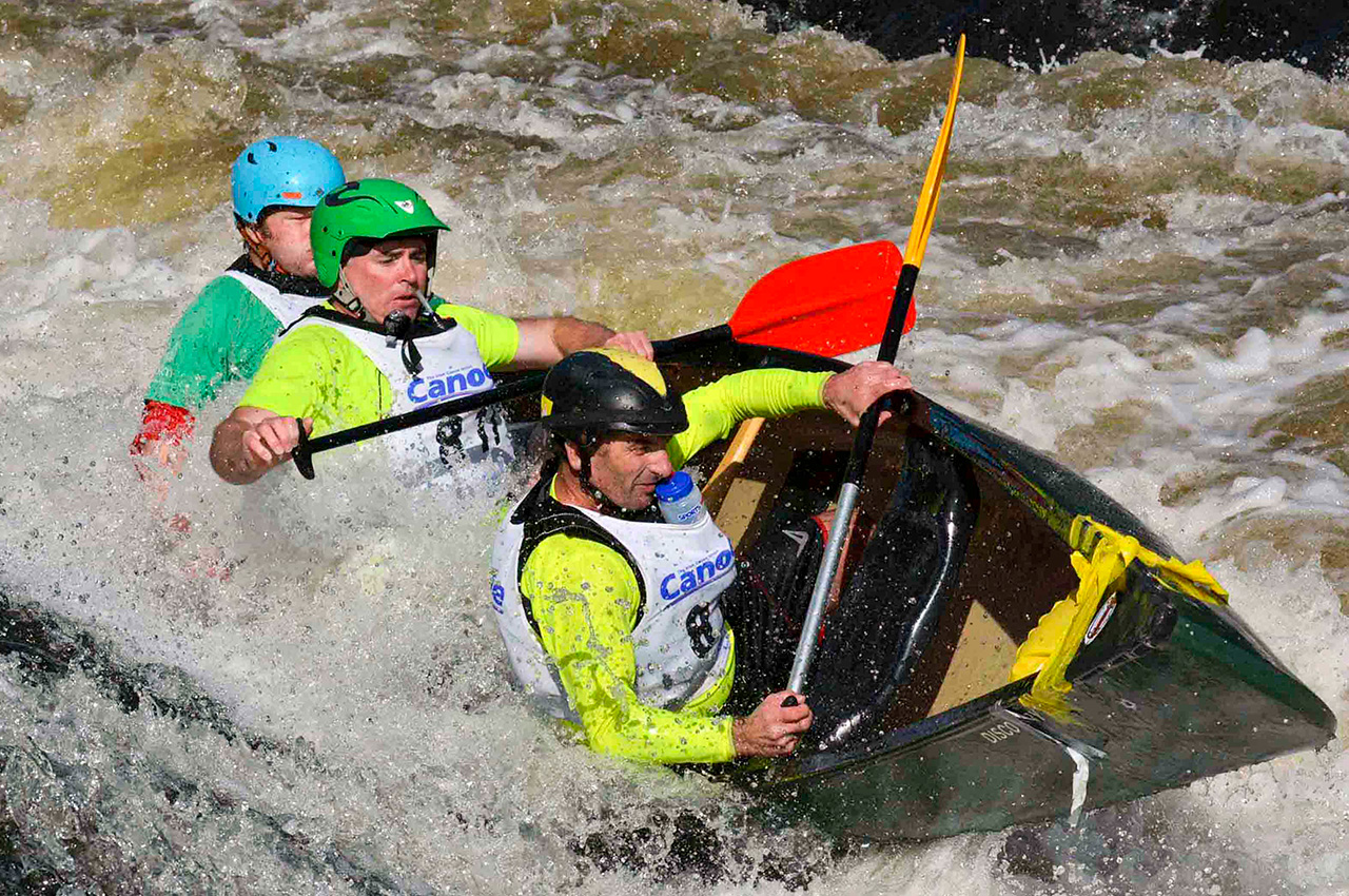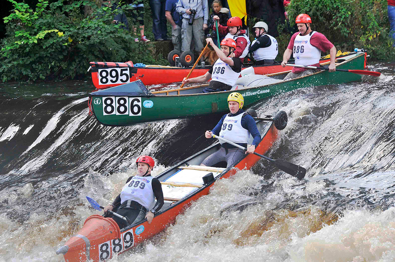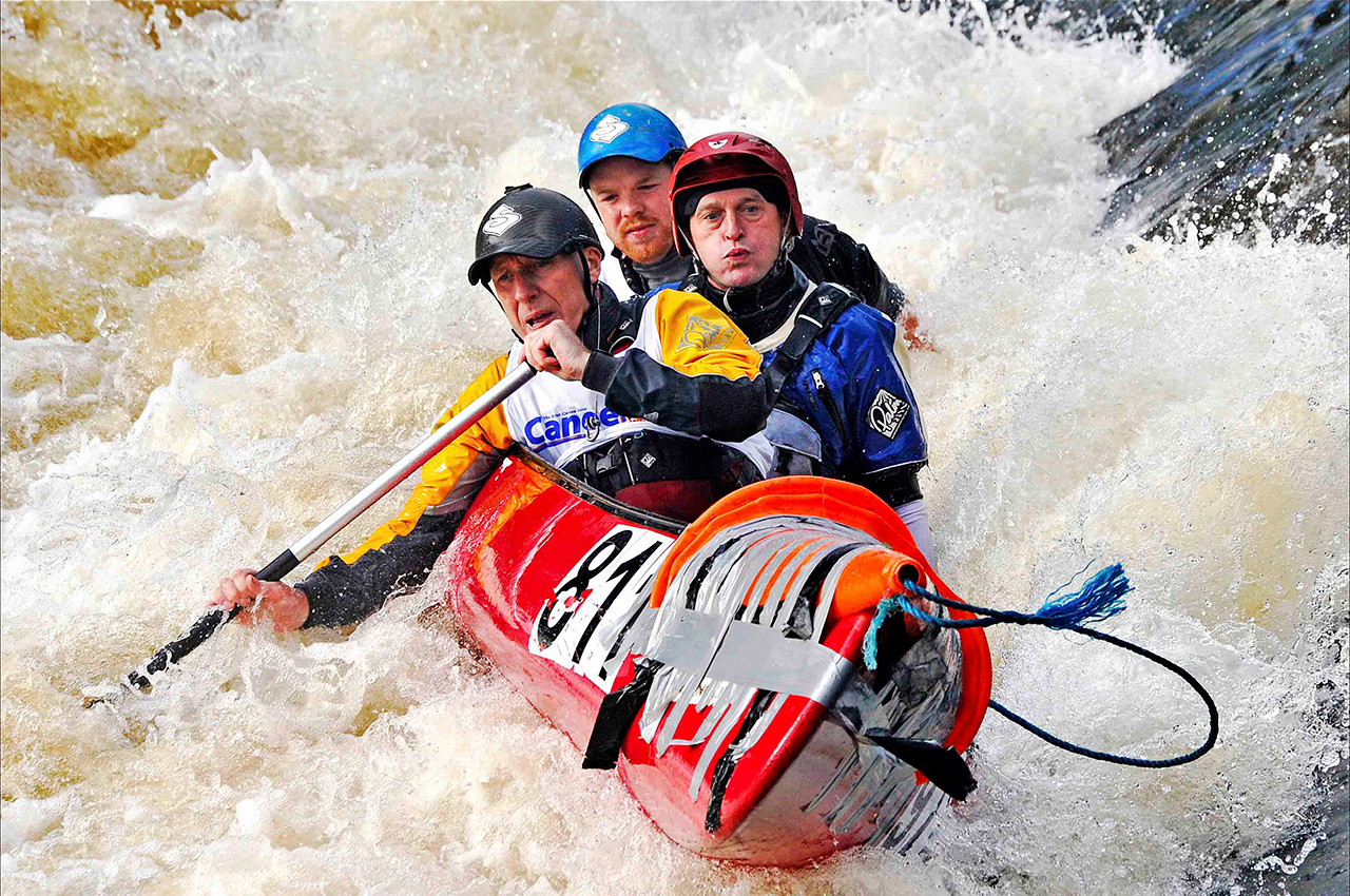 The event has changed with the passing years although the nature of the river remains unaltered. The equipment used has advanced from the soft-skinned kayaks of the very earliest days, through the era of fragile soft-topped fibreglass models to the Kevlar and plastic boats of today. Paddles have evolved from the symmetrical un-feathered type, through asymmetric blades, to today’s hollow shafted ‘wing paddles’ and paddlers are generally much fitter. This has resulted in less damage to boats and greatly improved times.