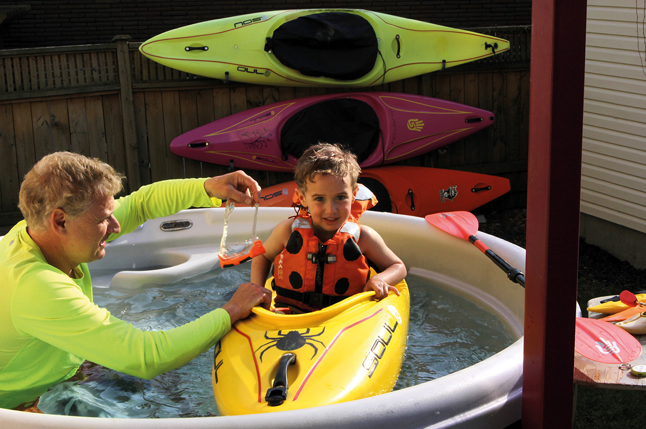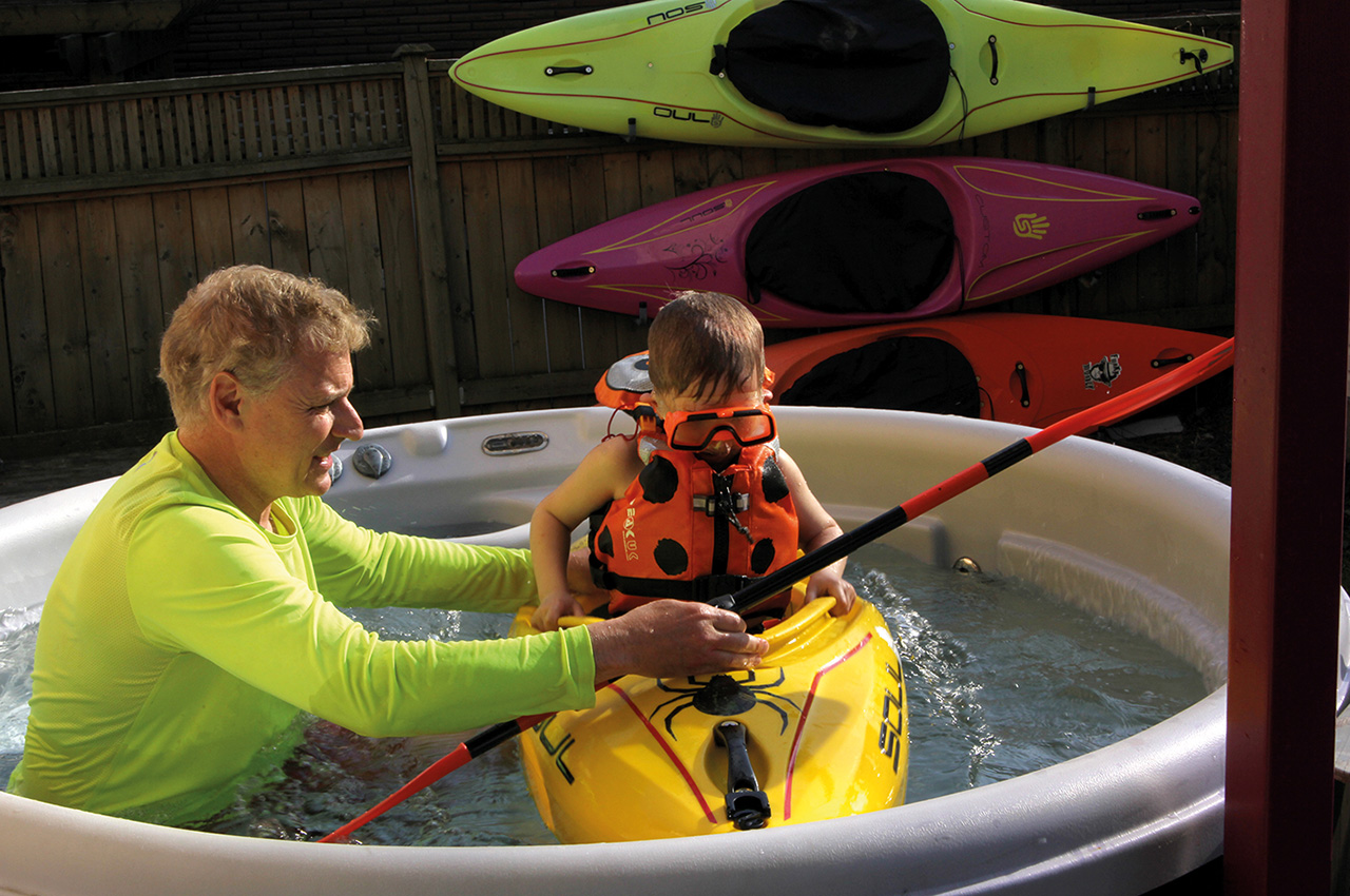 Combined with the river swimming, has been time spent in our spa: with and without his kayak. I have him diving underwater with the jets blasting, looking for trinkets at the bottom. This teaches him to hold his breath, and the constant racket and swirling water of the jets becomes normal. We make a game out of how many he can find at once and how long he can stay under.