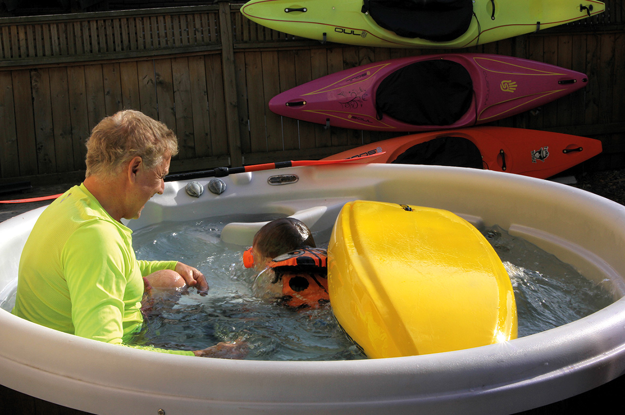 We put his kayak in the spa, and he sits in it and flips himself over; at first holding my hand and I’d pull him out before he was even upside down, and over time letting him do it entirely by himself; when he was ready.