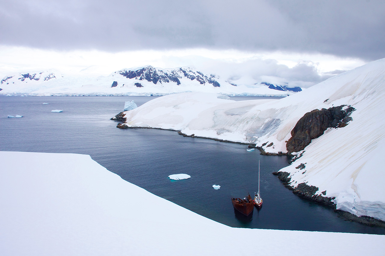 Dawn was just breaking when we arrived at Enterprise Island, Antarctica, and I had the wheel. I motored slowly down the narrow channel, avoiding barely-seen growlers (a kind of small, semi-submerged iceberg), before relinquishing control to Cath for the final approach into a sheltered anchorage, mooring up to the wreck of a century-old whaling ship. Tall ice cliffs surrounded us on three sides. Imperial shags flew back and forth, bringing squid to their hungry chicks. A pair of Antarctic terns wheeled noisily overhead, their shrill cries echoing in the frozen silence. We had arrived.