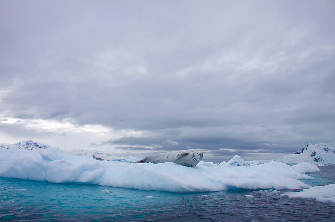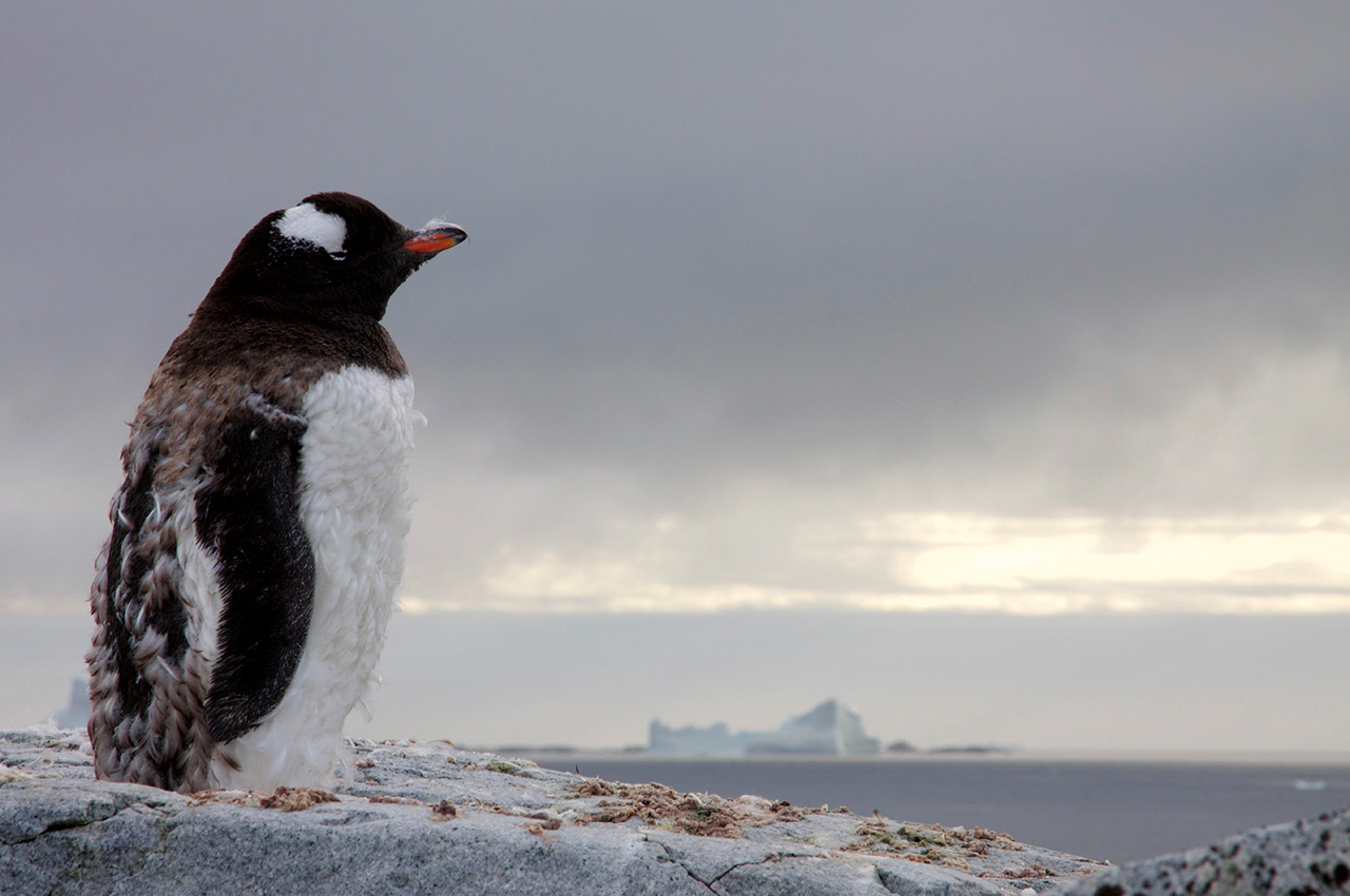 We soon pushed through the brash into a narrow channel between towering peaks. Penguins raced past us, porpoising briefly out the water for breath as they returned to feed their hungry chicks, bellies full of krill and squid. After an hour or so, we could smell the pungent aroma of guano, as we approached the largest Gentoo colony on the peninsula. Thousands of chicks, nearly fledged in their late-season plumage, lined the rocky shoreline and were clamouring for their parents to feed them one last time before they were abandoned to fend for themselves. An elephant seal eyed us lazily as we passed.