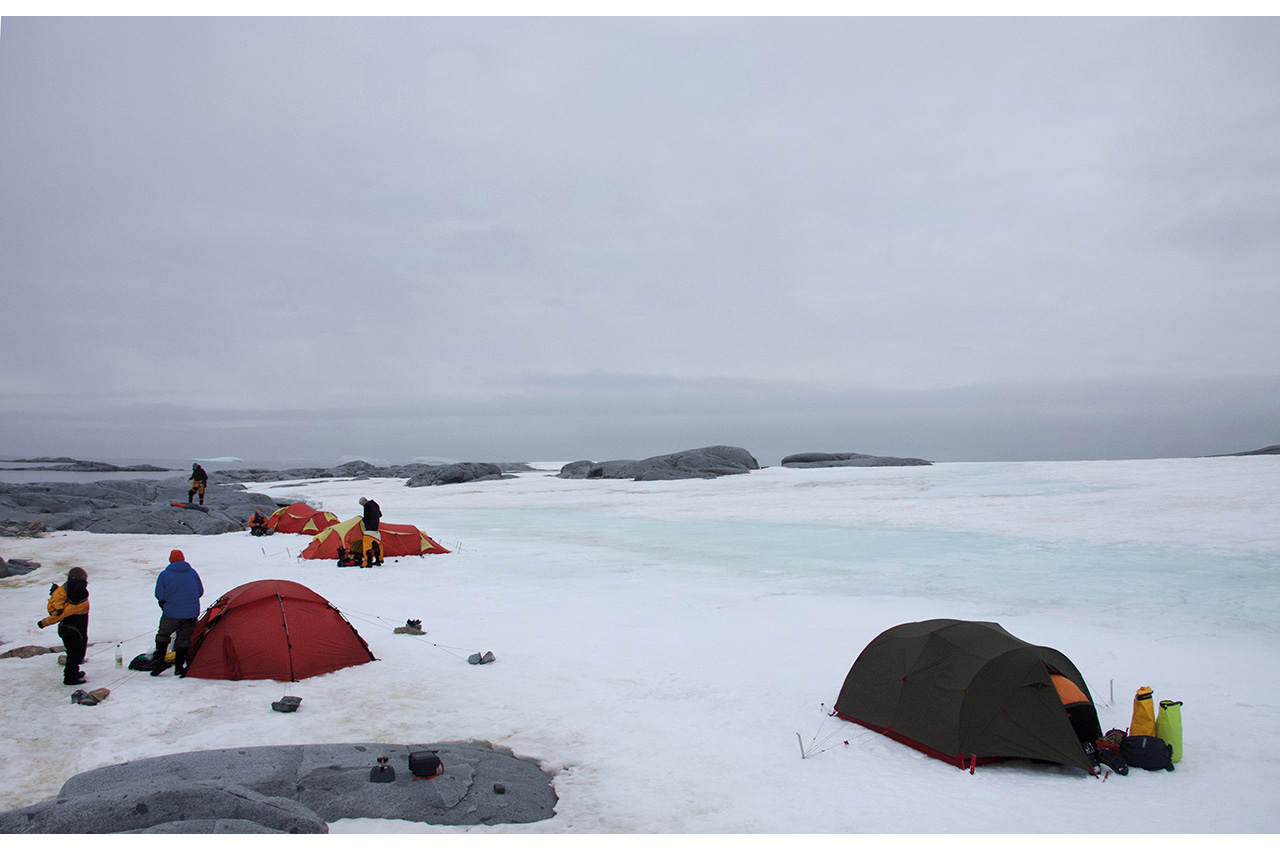 The polished dome of ice which was our home last night is slippery underfoot as I struggle back to my tent. A short burst of morning sun has melted it just enough to cover everything in a thin film of water, and I windmill my arms wildly as I make my way up the shallow slope, trying to avoid falling into a discoloured stream of snow algae and penguin poop.