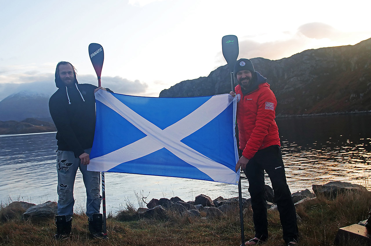 Once at Cape Wrath, Jordan bumped into fellow adventurer Charlie Head who is paddling in the opposite direction around Scotland. Jordan took the time to send me an exclusive photo of the two of them holding the Scottish flag. A meeting of two incredible men!