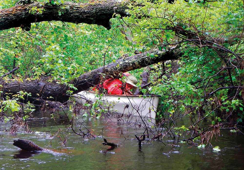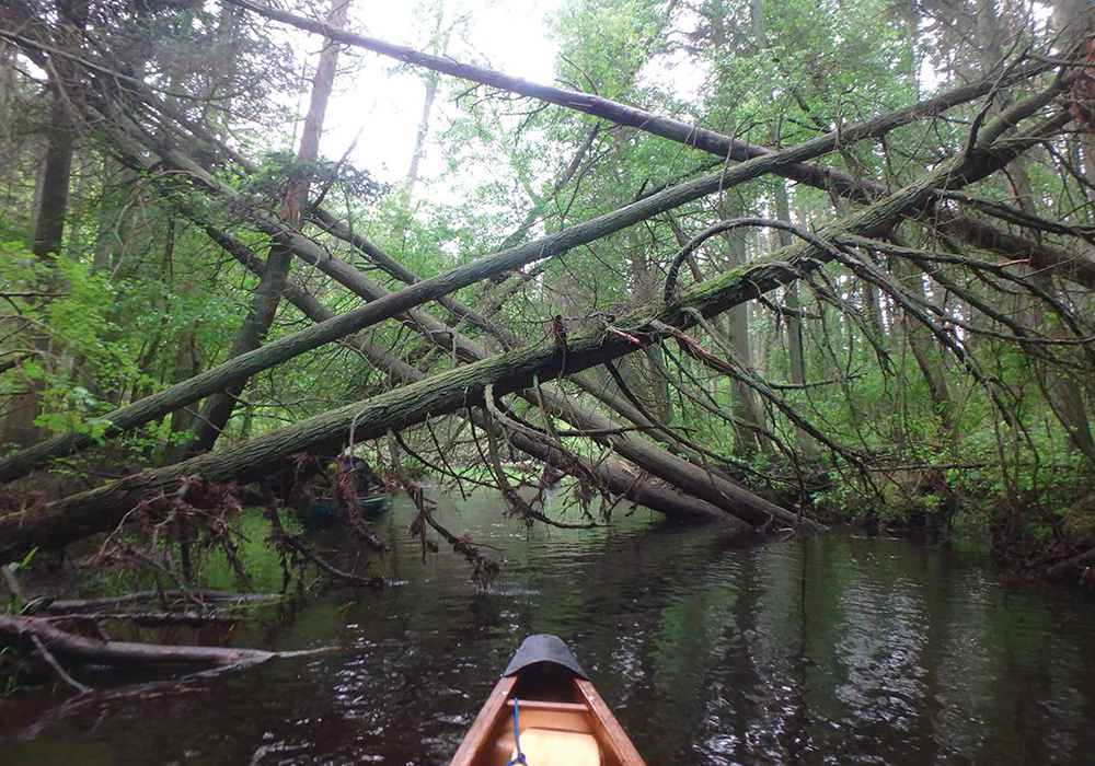 Some obstacles cannot be navigated with any reasonable degree of safety. The pile of trees and branches may be too massive with no path around or through it. Climbing over it may be unsafe due to the debris’s instability or slippery surfaces. Perhaps it’s a classic strainer where the current is so strong that there is a severe risk of pinning the canoe or, worse yet, getting yourself trapped. There is no shame in going to shore and taking your canoe for a walk in the woods.