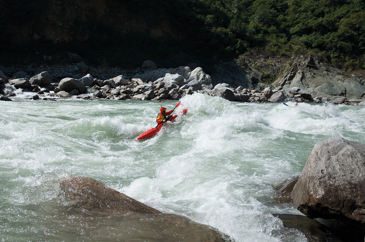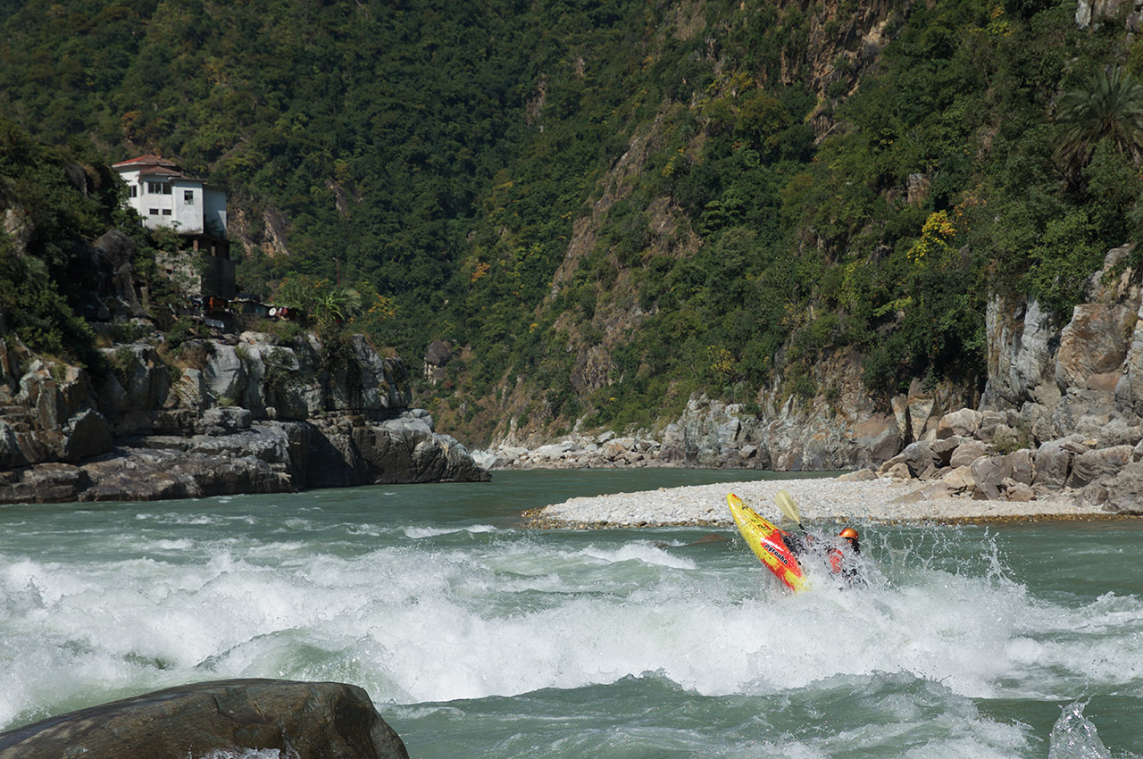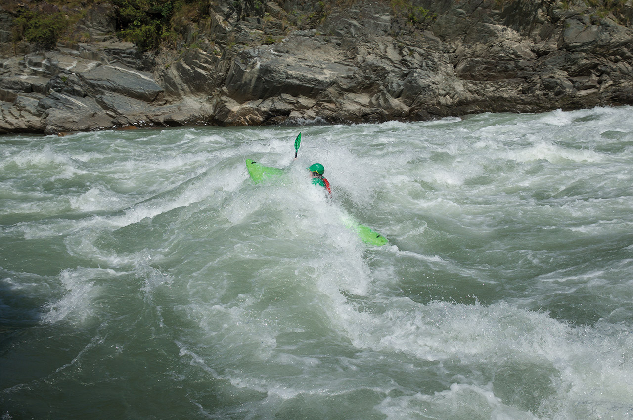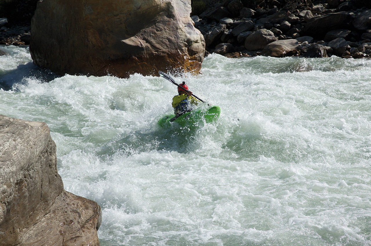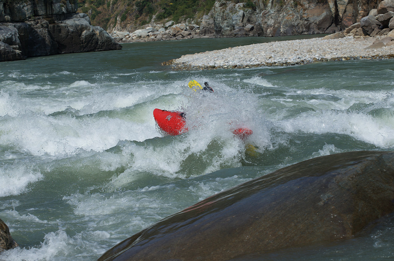 It is the section below the Tehri Dam that provides some great pool drop rapids in a beautiful gorge, well away from any roads or villages! You have to be careful to make sure they are releasing water from the dam. We kayaked with high water and it was so much fun, with big bouncy rapids and the odd hole to avoid. There are a couple of rapids that get the adrenaline flowing and the heart pumping, one of which finishes right above the confluence of the Alaknanda.