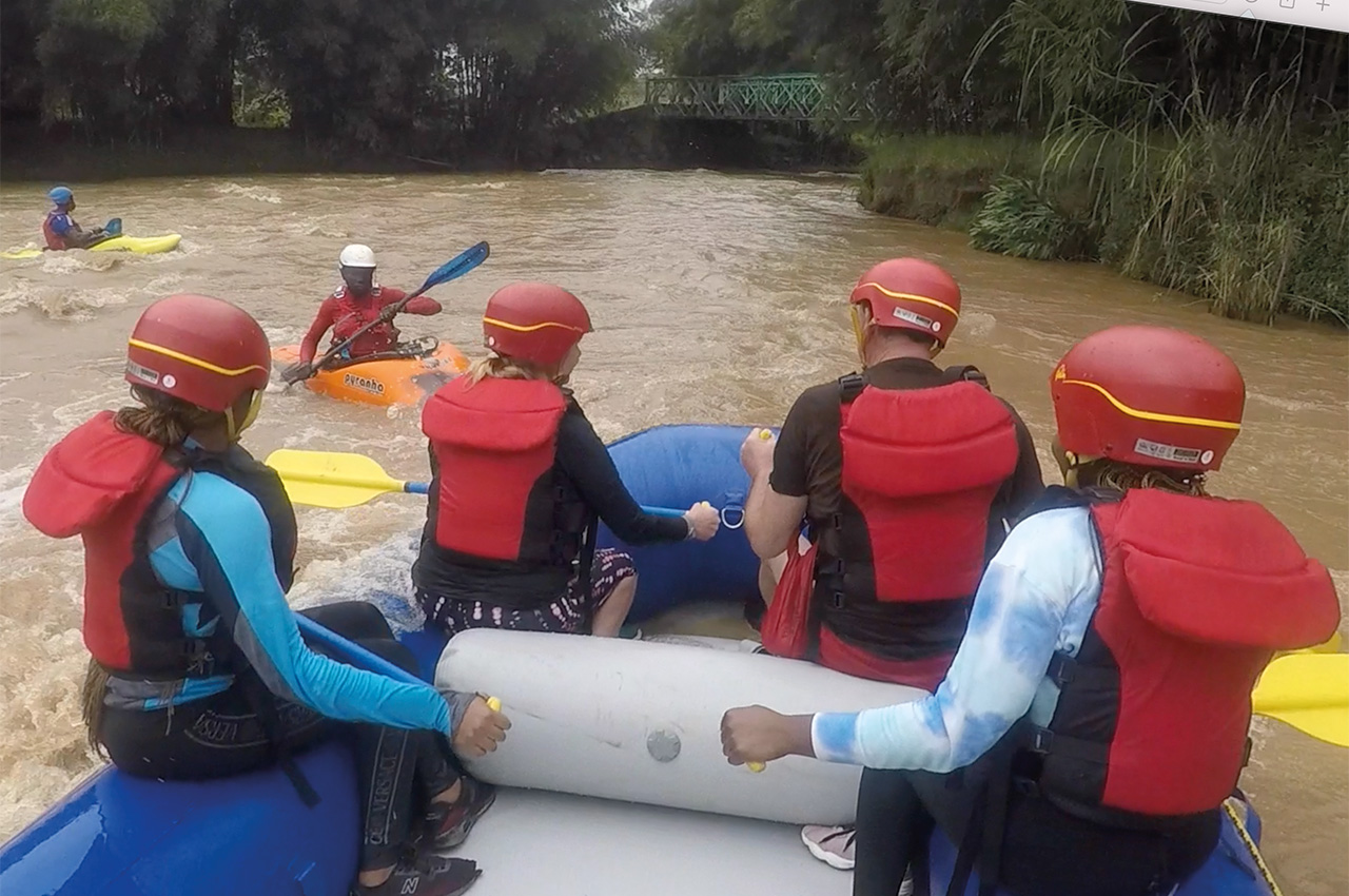 The L3 rapids on the run are all named, starting with the ‘Head-scratcher’, where we started and led straight into a series of 2-metre drops called ‘Baptism by Fire’. This is followed by a traversing wave called ‘The Dishwasher’, ‘Treacherous Corner’, ‘Spearhead’, ‘Grim Reaper’, and ‘Lost Shoe Swimming’. There are a good number of rapids with 2-3 metres drops that all live up to their names on this sporty, high-volume river. Towards the end of the run was ‘AJ Superhole’, where there was an opportunity to play in a big wave. The river trip ended with a drop down the complex adrenaline-inducing Utakufa Rapid on the outskirts of the Vunga.