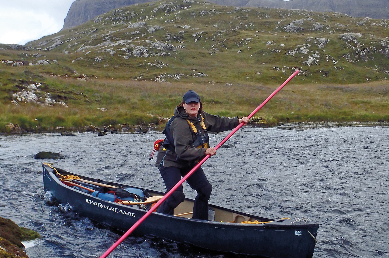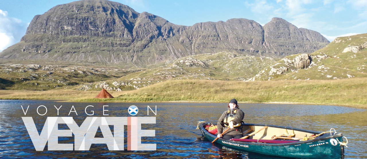 After a breakfast of freshly-cooked pancakes and mocha spread, washed down with filter coffee, we packed up camp, slipped through the shallow narrows again and through onto Loch Veyatie. As the loch narrows, it gently becomes a river only just deep enough to float a fully-laden canoe down. Using paddles to propel our boats would only serve to clatter our paddles and have limited control.