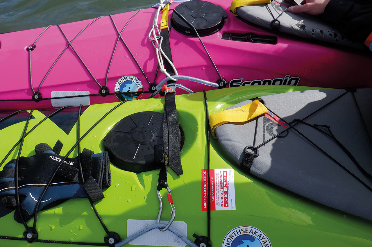 A good working short tow line is attached to the deck lines just in front of the cockpit and should be easily accessible on both sides of your kayak. You need to release it on one side so you can clip it onto another kayak’s deck lines. The tow line needs to be sturdy enough so you can tow an empty kayak back to the swimmer after a capsize, but also to tow a kayak with the kayaker still in it. It has to be so snag-free as possible (so preferably no knots in it).