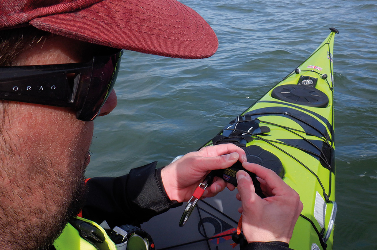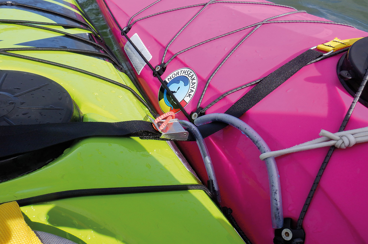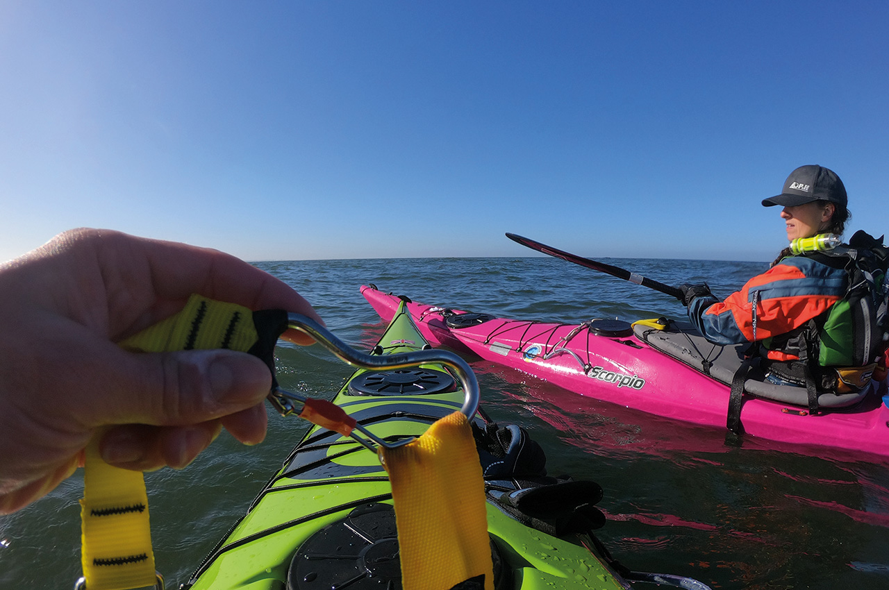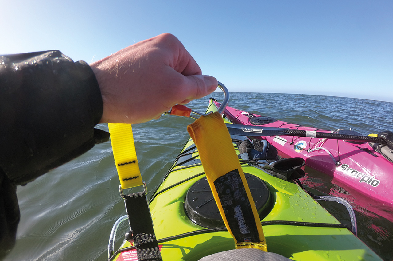 The Sea Contact Line is made of webbing instead of rope or elastics. Because of the stitching of the webbing around the carabiners, the line has no knots or unevenness, which can cause the line to snag under deck lines. The carabiners are one of a kind; they are a Whetman Equipment specific design and easy to clip and unclip, even when wearing neoprene gloves. They are user friendly, no-snag hazard and no sharp edges. During testing, we had no unwanted releases when towing other kayaks.