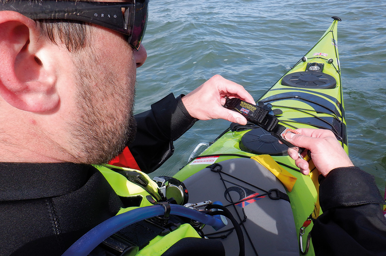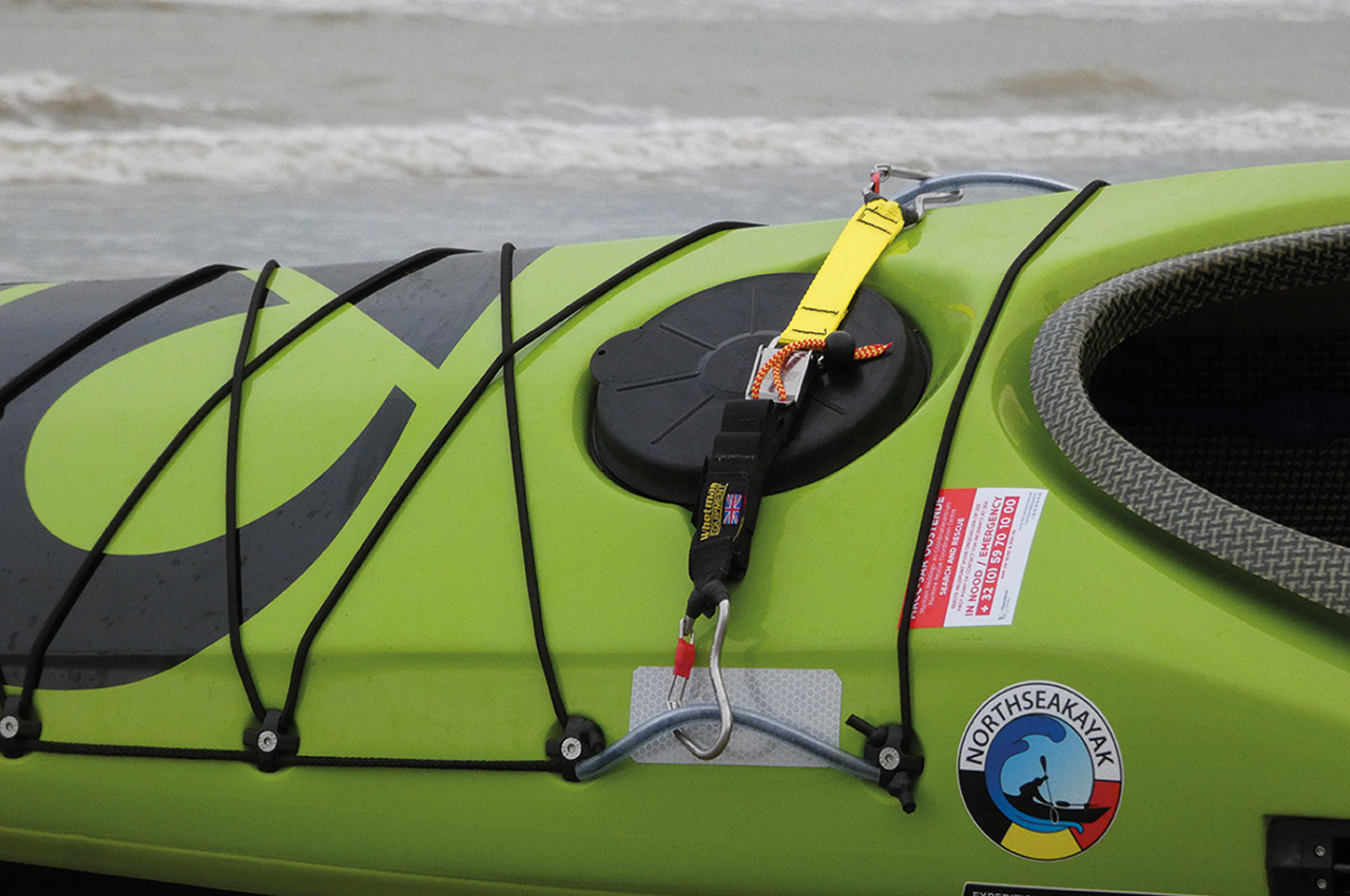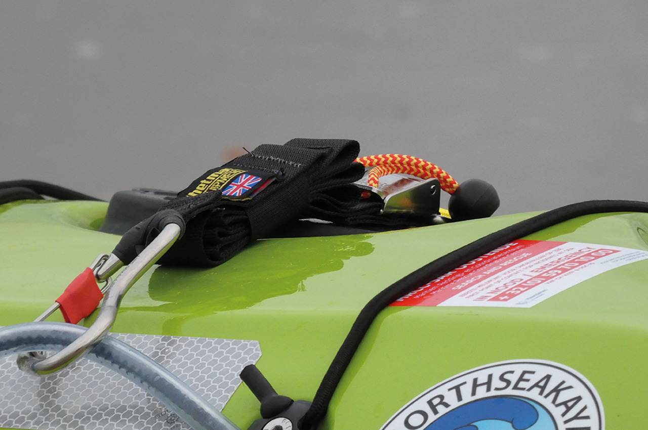 The Velcro that holds the folded webbing release swiftly under tension, but it holds on to the extra webbing when not in use. The only thing that needs a bit of training is refitting the extra webbing after use, so there is no extra webbing rolling around on your front deck. When doing this a few times, it’s even possible to refit the setup in rough conditions (of course, not in the surf zone).