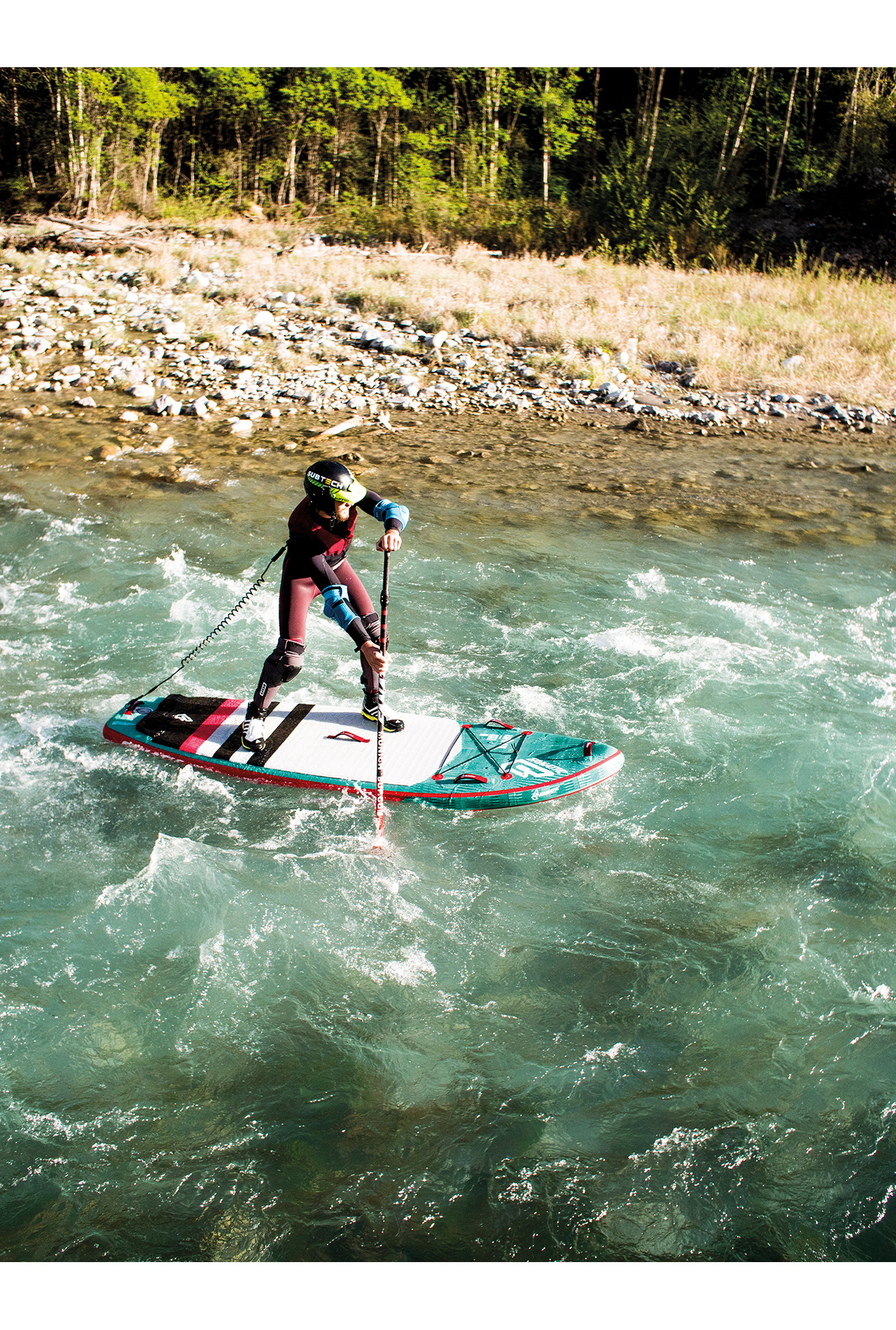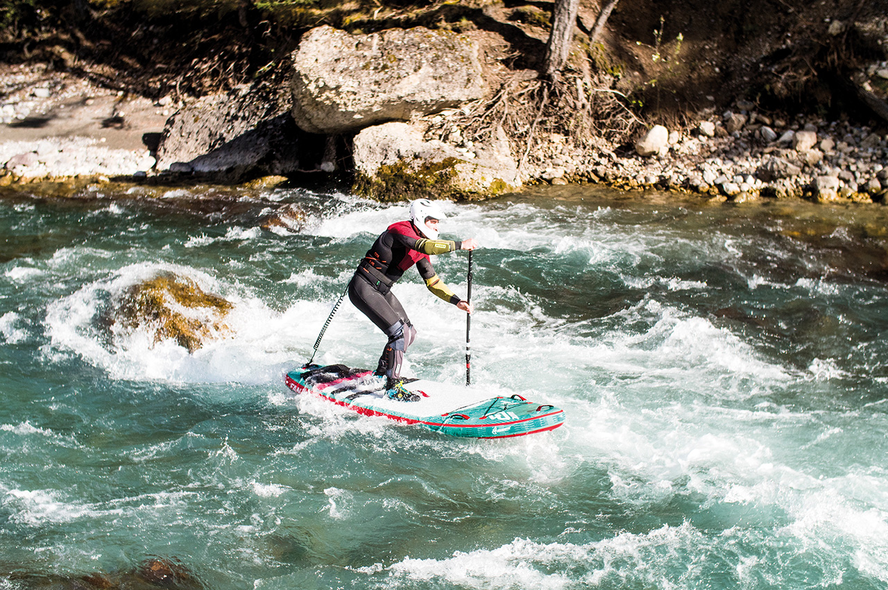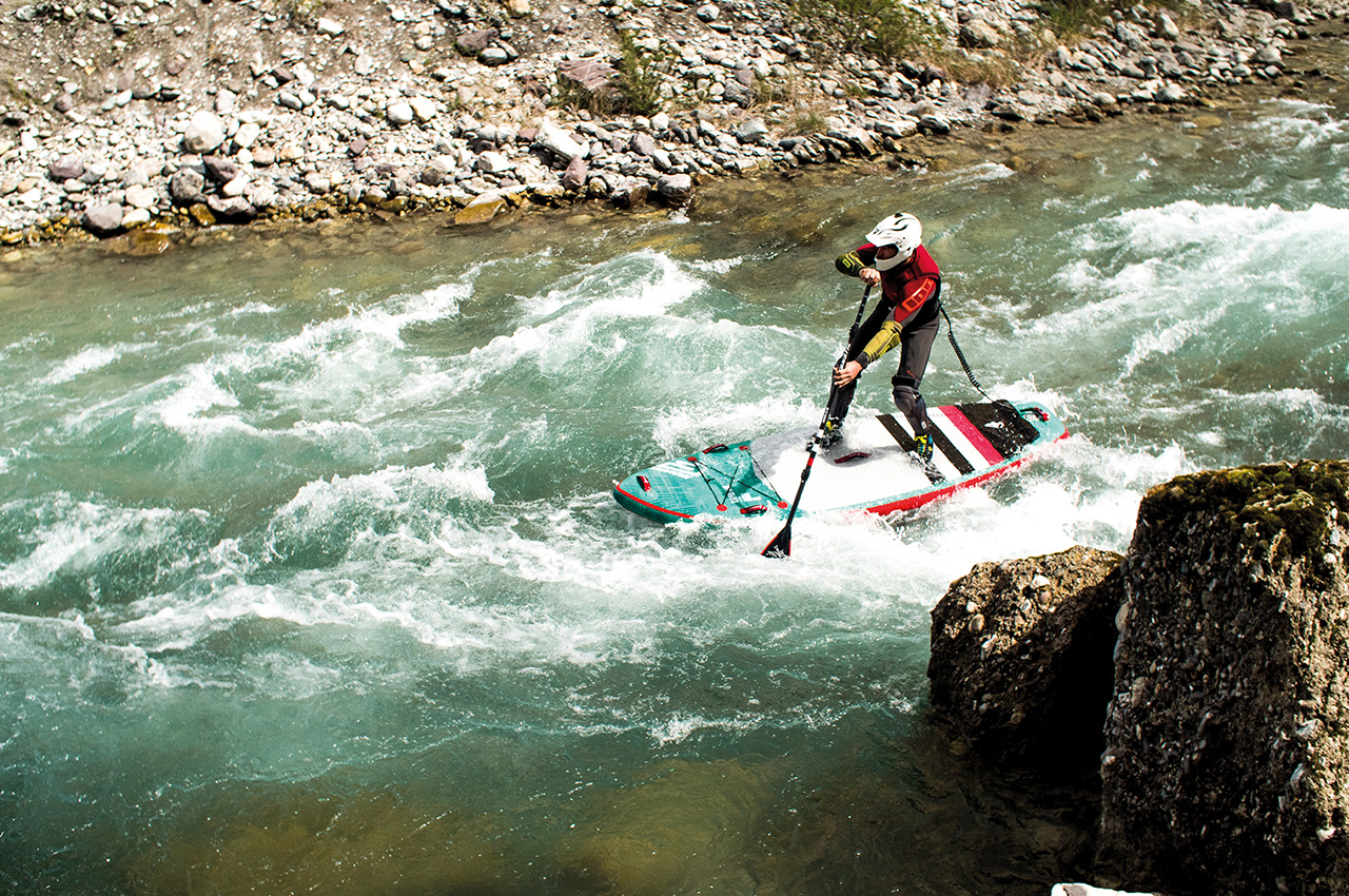 “Lower in the knees and now paddle on the right side and off to the drain, perfect,” sometimes I need some more tips to master heavy rapids cleanly and free from falls. Fortunately, I have the German champion, as well as the runner-up in whitewater SUP as a coach. Valentin also has whitewater rescue/safety training qualifications too. Again and again he mentions that, whilst on the river, it is very important to have strong faith in the team. To discuss, to co-ordinate different possibilities and, of course, to plan how to tackle more extreme water. This means discussing where the rest of the team is when a paddler travels to a location that sometimes presents dangers.