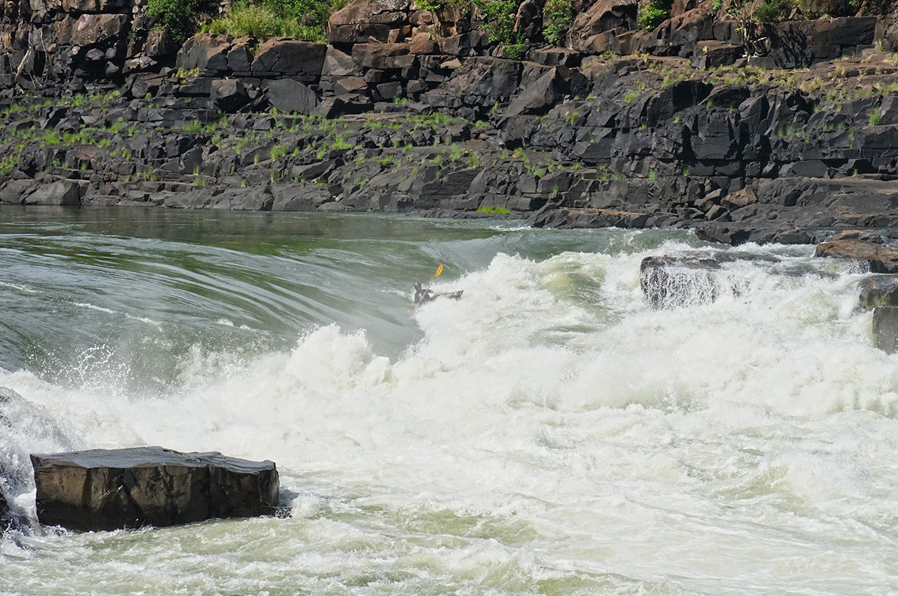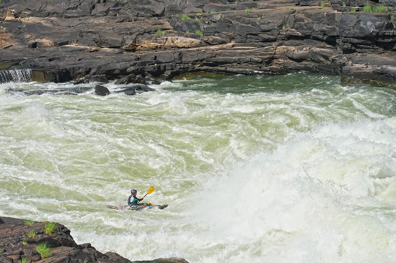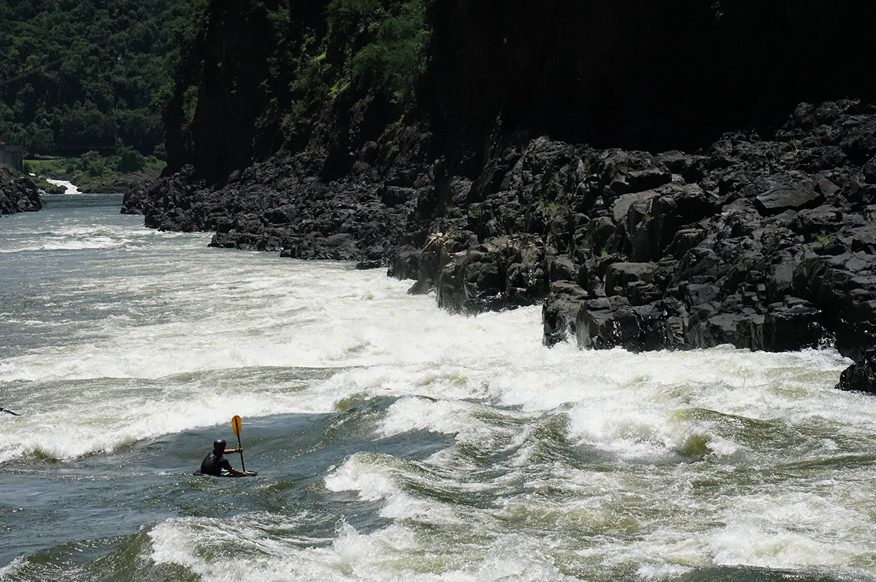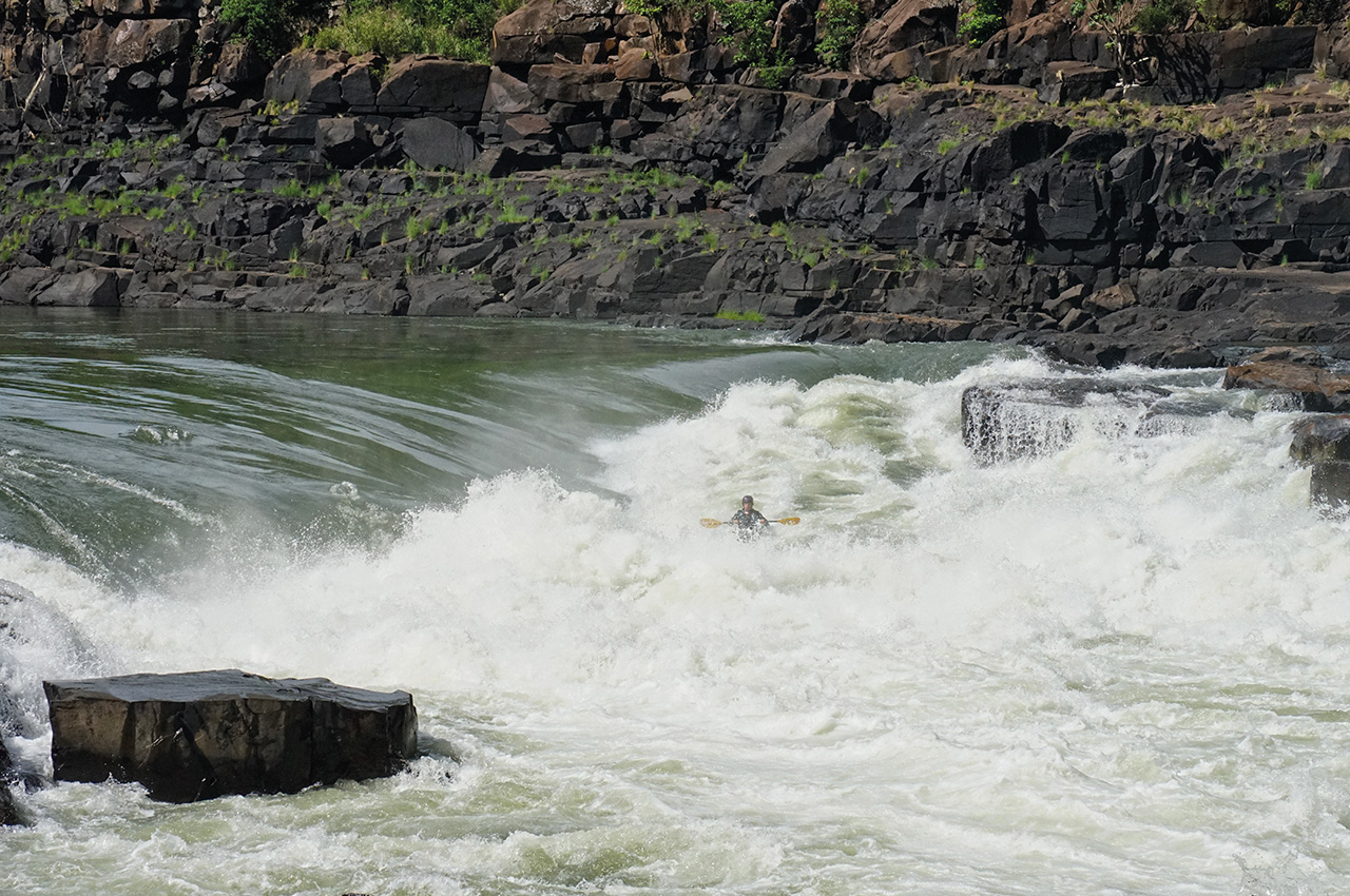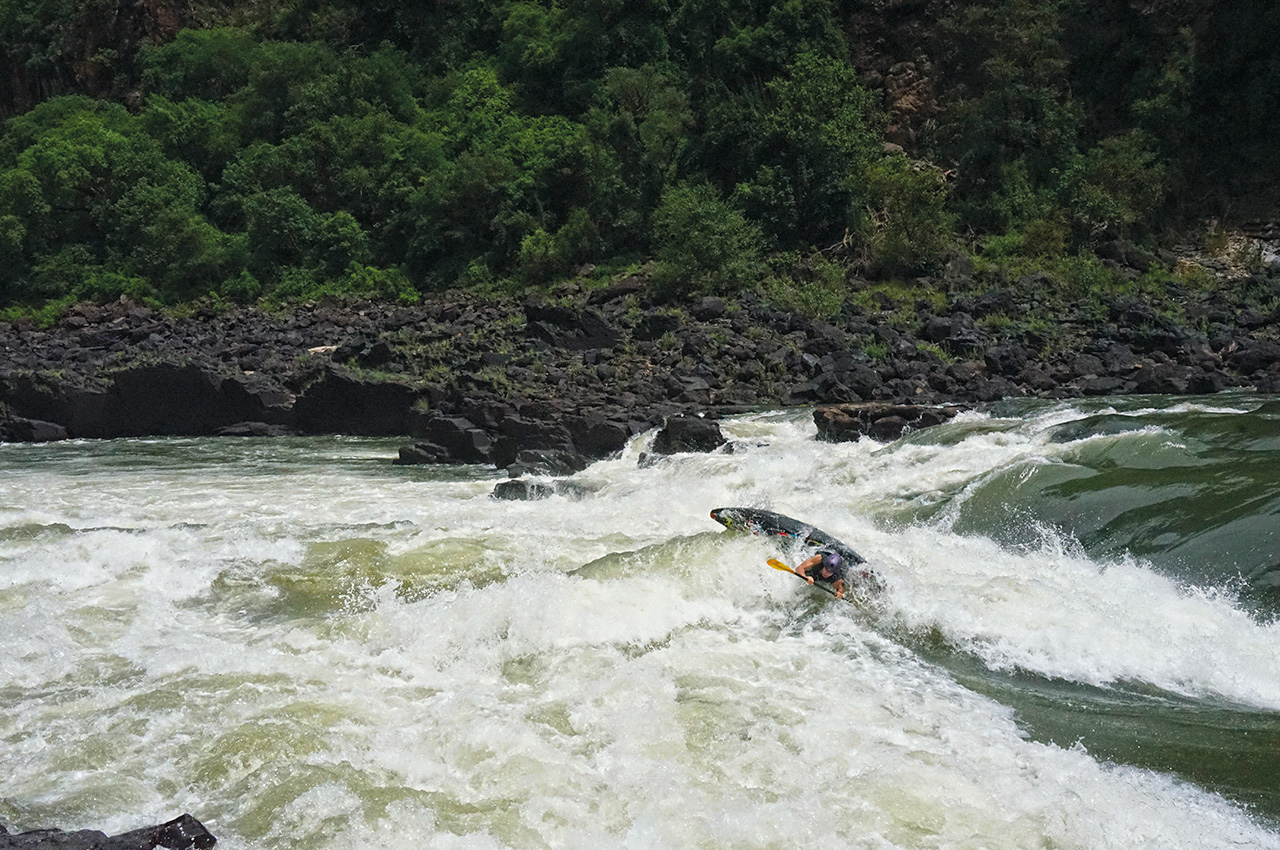 The iconic boof line of the ‘Stairway to Heaven’ is one of the most famous moves on the Zambezi. There are two lines for this rapid; you can follow the main flow down a tongue just left of the boof and down into the chaos of the crashing waves below. Or you can push right over a daring kickflip wave and hit the boof with as much speed as possible, leaving you in a much better position to deal with the oncoming waves. The line that follows the primary tongue got easier as the water level rose; while the waves stood up taller, they didn’t become much more powerful or harder to deal with. The boof, on the other hand, got very retentive as the level went up.